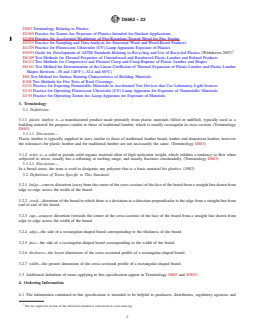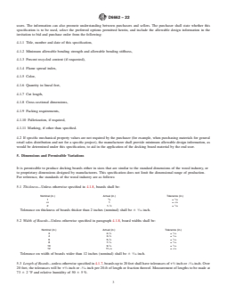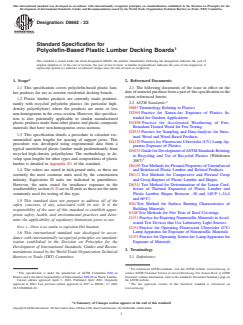 ASTM D6662-22 is a technical specification published by ASTM International. Its full title is "Standard Specification for Polyolefin-Based Plastic Lumber Decking Boards". This standard covers: ABSTRACT This specification covers polyolefin-based plastic lumber products for use as exterior residential decking boards. Plastic lumber products are currently made predominantly with recycled polyolefin plastics (in particular high-density polyethylene) where the products are more or less non-homogenous in the cross-section. However, this specification is also potentially applicable to similar manufactured plastic products made from other plastic and plastic composite materials that have non-homogenous cross-sections. Performance requirements to which the products should adhere to are flexural properties (allowable flexural stress, and effective modulus of elasticity and adjustment for creep), dimensional stability during thermal expansion, weatherability (surface appearance and flexural property changes, and hygrothermal cycling), fire properties, and slip resistance. Also detailed here is a procedure to calculate recommended span lengths for spacing of support joists. SCOPE 1.1 This specification covers polyolefin-based plastic lumber products for use as exterior residential decking boards. 1.2 Plastic lumber products are currently made predominantly with recycled polyolefin plastics (in particular high-density polyethylene) where the products are more or less non-homogenous in the cross-section. However, this specification is also potentially applicable to similar manufactured plastic products made from other plastic and plastic composite materials that have non-homogenous cross-sections. 1.3 This specification details a procedure to calculate recommended span lengths for spacing of support joists. This procedure was developed using experimental data from a typical unreinforced plastic lumber made predominantly from recycled high-density polyethylene. The methodology to develop span lengths for other types and compositions of plastic lumber is detailed in Appendix X1 of this standard. 1.4 The values are stated in inch-pound units, as these are currently the most common units used by the construction industry. Equivalent SI units are indicated in parentheses. However, the units stated for irradiance exposure in the weatherability section (6.3) are in SI units as these are the units commonly used for testing of this type. 1.5 This standard does not purport to address all of the safety concerns, if any, associated with its use. It is the responsibility of the user of this standard to establish appropriate safety, health, and environmental practices and determine the applicability of regulatory limitations prior to use. Note 1: There is no similar or equivalent ISO Standard. 1.6 This international standard was developed in accordance with internationally recognized principles on standardization established in the Decision on Principles for the Development of International Standards, Guides and Recommendations issued by the World Trade Organization Technical Barriers to Trade (TBT) Committee.