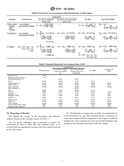 SIGNIFICANCE AND USE 4.1 This test method is available to producers and users of RDF to use in converting laboratory data from one basis to another. SCOPE 1.1 This test method gives equations to enable analytical data from the application of RDF analysis procedures to be expressed on various different bases in common use. Such bases are: as-received; dry; dry, ash-free; and others. 1.2 The values stated in SI units are to be regarded as standard. No other units of measurement are included in this standard. 1.3 This standard does not purport to address all of the safety concerns, if any, associated with its use. It is the responsibility of the user of this standard to establish appropriate safety, health, and environmental practices and determine the applicability of regulatory limitations prior to use. 1.4 This international standard was developed in accordance with internationally recognized principles on standardization established in the Decision on Principles for the Development of International Standards, Guides and Recommendations issued by the World Trade Organization Technical Barriers to Trade (TBT) Committee.