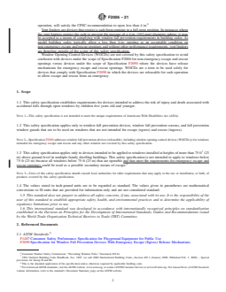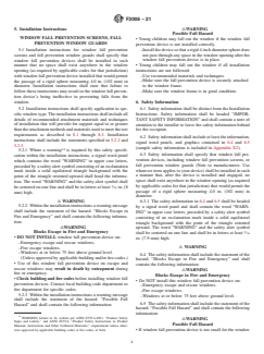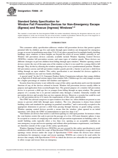 ASTM F2006-21 is a technical specification published by ASTM International. Its full title is "Standard Safety Specification for Window Fall Prevention Devices for Non-Emergency Escape (Egress) and Rescue (Ingress) Windows". This standard covers: SCOPE 1.1 This safety specification establishes requirements for devices intended to address the risk of injury and death associated with accidental falls through open windows by children five years old and younger. Note 1: This safety specification is not intended to meet the unique requirements of Americans With Disabilities Act (ADA). 1.2 This safety specification applies only to window fall prevention devices, window fall prevention screens, and fall prevention window guards that are to be used on windows that are not intended for escape (egress) and rescue (ingress). Note 2: Specification F2090 addresses window fall prevention devices (releasable), including window opening control devices (WOCD(s)) for windows intended for emergency escape and rescue and any other window not covered by this safety specification. 1.3 This safety specification applies only to devices intended to be applied to windows installed at heights of more than 75 ft7 (23 m) above ground level in multiple family dwelling buildings. This safety specification is not intended to apply to windows below 75 ft (23 m) because all windows below 75 ft (23 m) that are operable and that meet the requirements for emergency escape and rescue openings could be used as a possible secondary means of escape.8 Note 3: Users of this safety specification should consult local authorities for other requirements that may apply to the use or installation, or both, of products covered by this safety specification. 1.4 The values stated in inch-pound units are to be regarded as standard. The values given in parentheses are mathematical conversions to SI units that are provided for information only and are not considered standard. 1.5 This standard does not purport to address all safety concerns, if any, associated with its use. It is the responsibility of the user of this standard to establish appropriate safety, health, and environmental practices and to determine the applicability of regulatory limitations prior to use. 1.6 This international standard was developed in accordance with internationally recognized principles on standardization established in the Decision on Principles for the Development of International Standards, Guides and Recommendations issued by the World Trade Organization Technical Barriers to Trade (TBT) Committee.