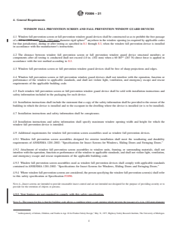 SCOPE 1.1 This safety specification establishes requirements for devices intended to address the risk of injury and death associated with accidental falls through open windows by children five years old and younger. Note 1: This safety specification is not intended to meet the unique requirements of Americans With Disabilities Act (ADA). 1.2 This safety specification applies only to window fall prevention devices, window fall prevention screens, and fall prevention window guards that are to be used on windows that are not intended for escape (egress) and rescue (ingress). Note 2: Specification F2090 addresses window fall prevention devices (releasable), including window opening control devices (WOCD(s)) for windows intended for emergency escape and rescue and any other window not covered by this safety specification. 1.3 This safety specification applies only to devices intended to be applied to windows installed at heights of more than 75 ft7 (23 m) above ground level in multiple family dwelling buildings. This safety specification is not intended to apply to windows below 75 ft (23 m) because all windows below 75 ft (23 m) that are operable and that meet the requirements for emergency escape and rescue openings could be used as a possible secondary means of escape.8 Note 3: Users of this safety specification should consult local authorities for other requirements that may apply to the use or installation, or both, of products covered by this safety specification. 1.4 The values stated in inch-pound units are to be regarded as standard. The values given in parentheses are mathematical conversions to SI units that are provided for information only and are not considered standard. 1.5 This standard does not purport to address all safety concerns, if any, associated with its use. It is the responsibility of the user of this standard to establish appropriate safety, health, and environmental practices and to determine the applicability of regulatory limitations prior to use. 1.6 This international standard was developed in accordance with internationally recognized principles on standardization established in the Decision on Principles for the Development of International Standards, Guides and Recommendations issued by the World Trade Organization Technical Barriers to Trade (TBT) Committee.