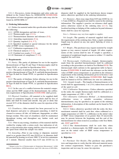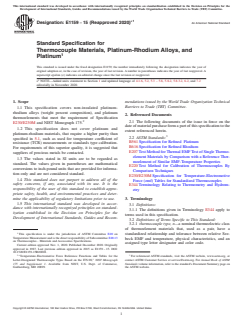 ASTM E1159-15(2020)e1 is a technical specification published by ASTM International. Its full title is "Standard Specification for Thermocouple Materials, Platinum-Rhodium Alloys, and Platinum". This standard covers: ABSTRACT This specification covers non-insulated platinum rhodium alloys (weight percent composition), and platinum thermo elements. The purity of platinum for use in the negative thermo element of Type R and Type S thermocouples shall be of a specific Grade, as specified. The purity of platinum before alloying for use in the positive thermo element of Type R, S, and both thermo elements of Type B shall also be of a certain grade, as specified. All material to be supplied shall consist of continuous lengths which shall be free of kinks and shall be round and smooth. Any pits or dents that exceed a certain percentage of the diameter shall be cause for rejection of the material. After material has been processed to its final diameter and prior to subsequent anneal, it shall be cleaned to remove all dirt, lubricant, fingerprints, or other foreign residue. The thermoelements shall be such that, when matched as a thermocouple, the EMF output shall meet the tolerance on the initial value of EMF versus temperature as specified. SCOPE 1.1 This specification covers non-insulated platinum-rhodium alloys (weight percent composition), and platinum thermoelements that meet the requirement of Specification E230/E230M and NIST Monograph 175.2 1.2 This specification does not cover platinum and platinum-rhodium materials, that require a higher purity than specified in 5.1, such as used for temperature coefficient of resistance (TCR) measurements or standards type calibration. For requirements of this superior quality, it is suggested that suppliers of precious metals be contacted. 1.3 The values stated in SI units are to be regarded as standard. The values given in parentheses are mathematical conversions to inch-pound units that are provided for information only and are not considered standard. 1.4 This standard does not purport to address all of the safety concerns, if any, associated with its use. It is the responsibility of the user of this standard to establish appropriate safety, health, and environmental practices and determine the applicability of regulatory limitations prior to use. 1.5 This international standard was developed in accordance with internationally recognized principles on standardization established in the Decision on Principles for the Development of International Standards, Guides and Recommendations issued by the World Trade Organization Technical Barriers to Trade (TBT) Committee.
