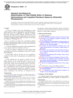 ASTM D6667-21 is a standard published by ASTM International. Its full title is "Standard Test Method for Determination of Total Volatile Sulfur in Gaseous Hydrocarbons and Liquefied Petroleum Gases by Ultraviolet Fluorescence". This standard covers: SIGNIFICANCE AND USE 4.1 The sulfur content of LPG, used for fuel purposes, contributes to SOx emissions and can lead to corrosion in engine and exhaust systems. Some process catalysts used in petroleum and chemical refining can be poisoned by sulfur bearing materials in the feed stocks. This test method can be used to determine sulfur in process feeds, to measure sulfur in finished products, and can also be used for compliance determinations when acceptable to a regulatory authority. SCOPE 1.1 This test method covers the determination of total volatile sulfur in gaseous hydrocarbons and liquefied petroleum (LP) gases. It is applicable to analysis of natural, processed, and final product materials. Precision has been determined for sulfur in gaseous hydrocarbons in the range of 1 mg/kg to 100 mg/kg and for sulfur in LP gases in the range of 1 mg/kg to 196 mg/kg (Note 1). Note 1: An estimate of pooled limit of quantification (PLOQ), information regarding sample stability and other general information derived from the interlaboratory studies on precision can be referenced in the ASTM research reports.2,3 1.2 This test method may not detect sulfur compounds that do not vaporize under the conditions of the test. 1.3 This test method is applicable for total volatile sulfur determination in LP gases containing less than 0.35 % (mass/mass) halogen(s). 1.4 The values stated in SI units are to be regarded as standard. No other units of measurement are included in this standard. 1.5 This standard does not purport to address all of the safety concerns, if any, associated with its use. It is the responsibility of the user of this standard to establish appropriate safety, health, and environmental practices and determine the applicability of regulatory limitations prior to use. See 3.1 and Sections 6 and 7 for specific warning statements. 1.6 This international standard was developed in accordance with internationally recognized principles on standardization established in the Decision on Principles for the Development of International Standards, Guides and Recommendations issued by the World Trade Organization Technical Barriers to Trade (TBT) Committee.