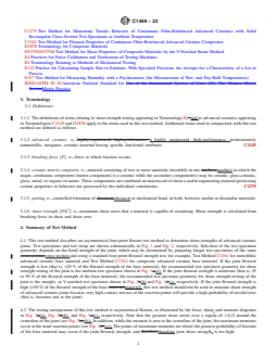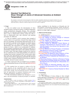 SIGNIFICANCE AND USE 5.1 Advanced ceramics can be candidate materials for structural applications requiring high degrees of wear and corrosion resistance, often at elevated temperatures. 5.2 Joints are produced to enhance the performance and applicability of materials. While the joints between similar materials are generally made for manufacturing complex parts and repairing components, those involving dissimilar materials usually are produced to exploit the unique properties of each constituent in the new component. Depending on the joining process, the joint region may be the weakest part of the component. Since under mixed-mode and shear loading the load transfer across the joint requires reasonable shear strength, it is important that the quality and integrity of joint under in-plane shear forces be quantified. Shear strength data are also needed to monitor the development of new and improved joining techniques. 5.3 Shear tests provide information on the strength and deformation of materials under shear stresses. 5.4 This test method may be used for material development, material comparison, quality assurance, characterization, and design data generation. 5.5 For quality control purposes, results derived from standardized shear test specimens may be considered indicative of the response of the material from which they were taken for given primary processing conditions and post-processing heat treatments. SCOPE 1.1 This test method covers the determination of shear strength of joints in advanced ceramics at ambient temperature using asymmetrical four-point flexure. Test specimen geometries, test specimen fabrication methods, testing modes (that is, force or displacement control), testing rates (that is, force or displacement rate), data collection, and reporting procedures are addressed. 1.2 This test method is used to measure shear strength of ceramic joints in test specimens extracted from larger joined pieces by machining. Test specimens fabricated in this way are not expected to warp due to the relaxation of residual stresses but are expected to be much straighter and more uniform dimensionally than butt-jointed test specimens prepared by joining two halves, which is not recommended. In addition, this test method is intended for joints, which have either low or intermediate strengths with respect to the substrate material to be joined. Joints with high strengths should not be tested by this test method because of the high probability of invalid tests resulting from fractures initiating at the reaction points rather than in the joint. Determination of the shear strength of joints using this test method is appropriate particularly for advanced ceramic matrix composite materials but also may be useful for monolithic advanced ceramic materials. 1.3 Values expressed in this test method are in accordance with the International System of Units (SI) and IEEE/ASTM SI 10. 1.4 This standard does not purport to address all of the safety concerns, if any, associated with its use. It is the responsibility of the user of this standard to establish appropriate safety, health, and environmental practices and determine the applicability of regulatory limitations prior to use. Specific precautionary statements are noted in 8.1. 1.5 This international standard was developed in accordance with internationally recognized principles on standardization established in the Decision on Principles for the Development of International Standards, Guides and Recommendations issued by the World Trade Organization Technical Barriers to Trade (TBT) Committee.