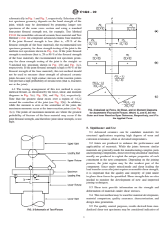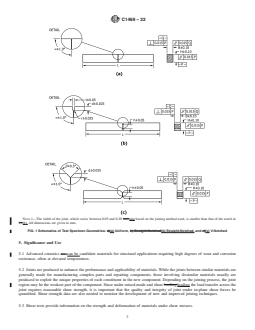 1.2 This test method is used to measure shear strength of ceramic joints in test specimens extracted from larger joined pieces by machining. Test specimens fabricated in this way are not expected to warp due to the relaxation of residual stresses but are expected to be much straighter and more uniform dimensionally than butt-jointed test specimens prepared by joining two halves, which is not recommended. In addition, this test method is intended for joints, which have either low or intermediate strengths with respect to the substrate material to be joined. Joints with high strengths should not be tested by this test method because of the high probability of invalid tests resulting from fractures initiating at the reaction points rather than in the joint. Determination of the shear strength of joints using this test method is appropriate particularly for advanced ceramic matrix composite materials but also may be useful for monolithic advanced ceramic materials.