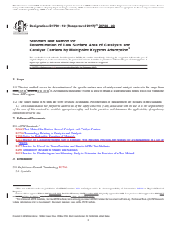 SIGNIFICANCE AND USE 5.1 This test method has been found useful for the determination of the specific surface area of catalysts and catalyst carriers in the range from 0.05 m2/g to 10 m2/g for materials specification, manufacturing control, and research and development in the evaluation of catalysts. The determination of surface area of catalysts and catalyst carriers above 10 m2/g is addressed in Test Method D3663 – Surface Area of Catalyst and Catalyst Carriers – and is appropriate for most samples with specific surface areas above 1 m2/g. SCOPE 1.1 This test method covers the determination of the specific surface area of catalysts and catalyst carriers in the range from 0.05 m2/g to 10 m2/g. A volumetric measuring system is used to obtain at least three data points which fall within the linear BET region. 1.2 The values stated in SI units are to be regarded as standard. No other units of measurement are included in this standard. 1.3 This standard does not purport to address all of the safety concerns, if any, associated with its use. It is the responsibility of the user of this standard to establish appropriate safety and health practices and determine the applicability of regulatory limitations prior to use.
