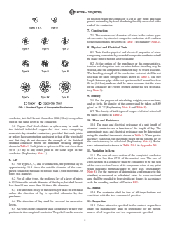 ABSTRACT This specification covers concentric-lay-stranded conductors made from uncoated hard-drawn round copper wires in combination with hard-drawn round copper-clad steel wires for general use as overhead electrical conductors. The conductors are classified under the following type designations: Type A, Type C, Type D, Type E, Type EK, Type F, Type G, Type J, Type K, Type N, Type P, and Type V. Welds and brazes may be made in copper rods or in copper wires prior to final drawing. Joints may not be made in the finished copper wires composing concentric-lay-stranded composite conductors containing a total of seven wires or less. In other conductors, welds and brazes may be made in the finished individual copper wires composing the conductor. Also, the joints or splices may be made in the finished individual copper-clad steel wires composing concentric-lay-stranded conductors, provided that such joints or splices have a protection equivalent to that of the wire itself and that they do not decrease the strength of the finished stranded conductor below the minimum breaking strength. The density, mass, and resistance of the wires shall be determined. SCOPE 1.1 This specification covers concentric-lay-stranded conductors made from uncoated hard-drawn round copper wires in combination with hard-drawn round copper-clad steel wires for general use as overhead electrical conductors. 1.2 For the purpose of this specification, conductors are classified under the following type designations (see Fig. 1): Type A Type G Type C Type J Type D Type K Type E Type N Type EK Type P Type F Type V FIG. 1 Standard Types of Composite Conductors 1.3 The SI values for density are regarded as the standard. For all other properties the inch-pound values are to be regarded as standard and the SI units may be approximate. 1.4 This international standard was developed in accordance with internationally recognized principles on standardization established in the Decision on Principles for the Development of International Standards, Guides and Recommendations issued by the World Trade Organization Technical Barriers to Trade (TBT) Committee.