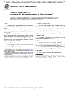 ASTM E236-66(2022) is a technical specification published by ASTM International. Its full title is "Standard Specification for Apparatus for Microdetermination of Alkoxyl Groups". This standard covers: ABSTRACT This specification covers the design and dimensional requirements for the apparatus used in the microdetermination of methoxyl and ethoxyl groups in organic compounds. This apparatus is composed of a reaction flask, condenser with scrubber, delivery tube, and two types of receivers—one for volumetric analysis, and the other for gravimetric analysis. SCOPE 1.1 This specification covers apparatus for the microdetermination of methoxyl and ethoxyl groups in organic compounds. Note 1: This specification was originally developed by the Committee on Microchemical Apparatus, Division of Analytical Chemistry, American Chemical Society.2 1.2 This international standard was developed in accordance with internationally recognized principles on standardization established in the Decision on Principles for the Development of International Standards, Guides and Recommendations issued by the World Trade Organization Technical Barriers to Trade (TBT) Committee.