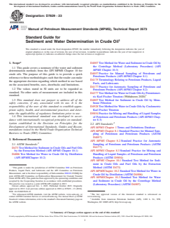 ASTM D7829-23 is a guide published by ASTM International. Its full title is "Standard Guide for Sediment and Water Determination in Crude Oil". This standard covers: SIGNIFICANCE AND USE 4.1 Theoretically, all of the sediment and water determination methods are valid for crude oils containing from 0 % to 100 % by volume sediment and water; the range of application is specified within the scope of each method. The round robins for all methods were conducted on relatively dry oil. All precision and bias statements included in the methods are based upon the round robin data. Analysis becomes more challenging with crude oils containing higher water contents due to the difficulty in obtaining a representative sample, and maintaining the sample quality until analysis begins. 4.2 Currently, Karl Fischer is generally used for dry crude oils containing less than 5 % water. Distillation is most commonly used for dry and wet crude oils and where separate sediment analysis is available or in situations where the sediment result is not significant. The laboratory centrifuge methods allow for determination of total sediment and water in a single analysis. The field centrifuge method is used when access to controlled laboratory conditions are not available. 4.3 In the event of a dispute with regard to sediment and water content, contracting parties may refer to the technical specifications table to determine the most appropriate referee method based upon knowledge of and experience with the crude oil or product stream. SCOPE 1.1 This guide covers a summary of the water and sediment determination methods from the API MPMS Chapter 10 for crude oils. The purpose of this guide is to provide a quick reference to these methodologies such that the reader can make the appropriate decision regarding which method to use based on the associated benefits, uses, drawbacks and limitations. 1.2 The values stated in SI units are to be regarded as standard. No other units of measurement are included in this standard. 1.3 This standard does not purport to address all of the safety concerns, if any, associated with its use. It is the responsibility of the user of this standard to establish appropriate safety, health, and environmental practices and determine the applicability of regulatory limitations prior to use. 1.4 This international standard was developed in accordance with internationally recognized principles on standardization established in the Decision on Principles for the Development of International Standards, Guides and Recommendations issued by the World Trade Organization Technical Barriers to Trade (TBT) Committee.
