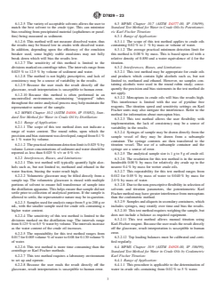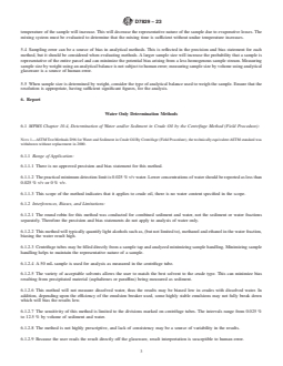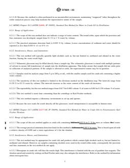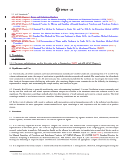 SIGNIFICANCE AND USE 4.1 Theoretically, all of the sediment and water determination methods are valid for crude oils containing from 0 % to 100 % by volume sediment and water; the range of application is specified within the scope of each method. The round robins for all methods were conducted on relatively dry oil. All precision and bias statements included in the methods are based upon the round robin data. Analysis becomes more challenging with crude oils containing higher water contents due to the difficulty in obtaining a representative sample, and maintaining the sample quality until analysis begins. 4.2 Currently, Karl Fischer is generally used for dry crude oils containing less than 5 % water. Distillation is most commonly used for dry and wet crude oils and where separate sediment analysis is available or in situations where the sediment result is not significant. The laboratory centrifuge methods allow for determination of total sediment and water in a single analysis. The field centrifuge method is used when access to controlled laboratory conditions are not available. 4.3 In the event of a dispute with regard to sediment and water content, contracting parties may refer to the technical specifications table to determine the most appropriate referee method based upon knowledge of and experience with the crude oil or product stream. SCOPE 1.1 This guide covers a summary of the water and sediment determination methods from the API MPMS Chapter 10 for crude oils. The purpose of this guide is to provide a quick reference to these methodologies such that the reader can make the appropriate decision regarding which method to use based on the associated benefits, uses, drawbacks and limitations. 1.2 The values stated in SI units are to be regarded as standard. No other units of measurement are included in this standard. 1.3 This standard does not purport to address all of the safety concerns, if any, associated with its use. It is the responsibility of the user of this standard to establish appropriate safety, health, and environmental practices and determine the applicability of regulatory limitations prior to use. 1.4 This international standard was developed in accordance with internationally recognized principles on standardization established in the Decision on Principles for the Development of International Standards, Guides and Recommendations issued by the World Trade Organization Technical Barriers to Trade (TBT) Committee.