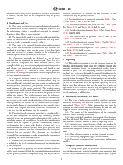 SIGNIFICANCE AND USE 4.1 This guide provides the recommended data elements for the identification of fiber-reinforced composite materials and the information which is considered essential to uniquely describe a fiber, filler, or core material. 4.2 The intent of this guide is to provide sufficient detail that values are known for the material parameters that may influence test results or material property values. 4.3 This guide is for material identification and description only. It does not include the recommended data elements for mechanical test data or other specific types of test data. Such items are covered by separate formats to be referenced in material specifications or other test standards. 4.4 Composite materials are defined as two or more materials that are combined on a macroscale. There is a gray area between composites and other material classes. Two examples of this gray area between polymer matrix composites and plastics are toughened polystyrene and liquid crystal polymer. Appendix X1 contains a table, which provides guidelines for distinguishing between reinforced polymers and polymer matrix composites. 4.5 Composite materials consist of a matrix phase and one or more discrete reinforcements. Reinforcements may be interpreted broadly to include any macroscale second material, including fibers, particulates, precipitated particles, or structured domains of the parent material. The reinforcements covered in this guide include fibers and such particulates and precipitated particles that can be described adequately as filler within the matrix. The reinforcements may be polymers, metals, ceramics, or other materials. Sandwich constructions are covered by this guide via identification of the core material. These guidelines are suitable for the identification of composites in simple shapes of constant thickness; for example, plates or tubes. For complex structures, additional information relevant to a specific application may be required. 4.6 Classification of ... SCOPE 1.1 This guide establishes essential and desirable identification elements for fiber-reinforced composite materials and for fibers, fillers, and core materials, matrices, preforms, prepregs, processes, and parts used in these composite materials. This guide is intended for preparing test reports, databases, and material documents. 1.2 These guidelines are specific to fiber-reinforced polymer-matrix composite materials. Composite materials, which also contain particulates or precipitated particles, are also included, provided they can be described adequately as a filler in the matrix. 1.3 The materials covered by this guide include fibers, both continuous and discontinuous, and fillers of various geometries which are used as reinforcements in composite materials, as well as core materials used in sandwich composites, matrices both thermoset and thermoplastic, fiber preforms, prepreg product forms, manufacturing processes, and generic part forms. Cores may be foam, honeycomb, or naturally occurring materials such as balsa wood. These materials are distinguished from bulk materials by the importance of their specialized geometric forms to their properties. This difference is reflected in the use of geometry, along with chemistry, as a primary basis for classification. Additional data elements that are considered desirable, but not essential, are also defined. The purpose is to allow the meaningful comparison of data from different sources. 1.4 Data elements in this guide are relevant to test data, data as obtained in the test laboratory and historically recorded in laboratory notebooks. Property data, data that have been analyzed and reviewed, may only need a subset of these data elements. 1.5 This standard does not purport to address all of the safety concerns, if any, associated with its use. It is the responsibility of the user of this standard to establish appropriate safety, health, and environmental practi...