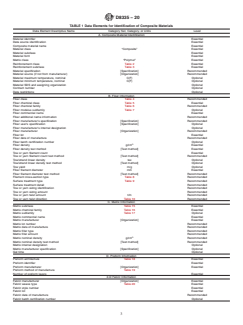• Essential Data Elements: ASTMD8335-20 defines essential and recommended data elements needed to accurately describe fiber-reinforced polymer composites. These include information about material type, class, chemical composition, geometric form, and specific properties of fibers, fillers, matrices, and cores.