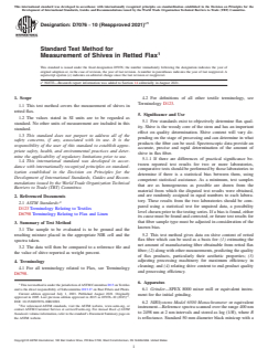 ASTM D7076-10(2021)e1 is a standard published by ASTM International. Its full title is "Standard Test Method for Measurement of Shives in Retted Flax". This standard covers: SIGNIFICANCE AND USE 5.1 Few standards exist to objectively determine flax quality. Shive is the woody core of the stem and has an important effect on quality determination. Shive content will vary depending on the stage of processing and can determine in what products the fiber can be used. Spectroscopic data provide an accurate, precise and rapid determination of the amount of shive in flax fiber. 5.1.1 If there are differences of practical significance between reported test results for two or more laboratories, comparative tests should be performed by those laboratories to determine if there is a statistical bias between them, using competent statistical assistance. As a minimum, test samples that are as homogeneous as possible are drawn from the material from which the disputed test results were obtained, and are randomly assigned in equal numbers to each laboratory. These results from the two laboratories should be compared using a statistical test for unpaired data, a possibility level chosen prior to the testing series. If a bias is found, either its cause must be found and corrected, or future test results for that fiber sample type must be adjusted in consideration of the known bias. 5.2 This test method gives data on shive content of retted flax fiber which can be used as a basis for: (1) estimating the net amount of manufacturing fiber obtainable from retted flax fiber; (2) along with other measurements, predicting the quality of flax products, particularly their aesthetic properties; (3) adjusting processing machinery for maximum efficiency in cleaning; and (4) relating shive content to end-product quality and processing efficiency. SCOPE 1.1 This test method covers the measurement of shives in retted flax. 1.2 The values stated in SI units are to be regarded as standard. No other units of measurement are included in this standard. 1.3 This standard does not purport to address all of the safety concerns, if any, associated with its use. It is the responsibility of the user of this standard to establish appropriate safety, health, and environmental practices and determine the applicability of regulatory limitations prior to use. 1.4 This international standard was developed in accordance with internationally recognized principles on standardization established in the Decision on Principles for the Development of International Standards, Guides and Recommendations issued by the World Trade Organization Technical Barriers to Trade (TBT) Committee.