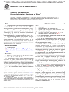 SIGNIFICANCE AND USE 4.1 The Knoop indentation hardness is one of many properties that is used to characterize glasses. Attempts have been made to relate Knoop indentation hardness to tensile strength, grinding speeds, and other hardness scales, but no generally accepted methods are available. Such conversions are limited in scope and should be used with caution, except for special cases where a reliable basis for the conversion has been obtained by comparison tests. SCOPE 1.1 This test method covers the determination of the Knoop indentation hardness of glass and the verification of Knoop indentation hardness testing machines using standard glasses. 1.2 This standard does not purport to address all of the safety concerns, if any, associated with its use. It is the responsibility of the user of this standard to establish appropriate safety, health, and environmental practices and determine the applicability of regulatory limitations prior to use. 1.3 This international standard was developed in accordance with internationally recognized principles on standardization established in the Decision on Principles for the Development of International Standards, Guides and Recommendations issued by the World Trade Organization Technical Barriers to Trade (TBT) Committee.