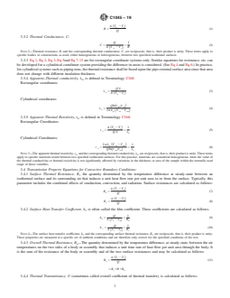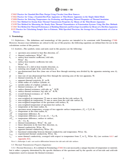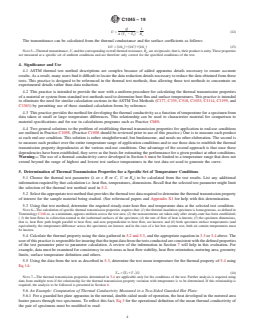 SIGNIFICANCE AND USE 4.1 ASTM thermal test method descriptions are complex because of added apparatus details necessary to ensure accurate results. As a result, many users find it difficult to locate the data reduction details necessary to reduce the data obtained from these tests. This practice is designed to be referenced in the thermal test methods, thus allowing those test methods to concentrate on experimental details rather than data reduction. 4.2 This practice is intended to provide the user with a uniform procedure for calculating the thermal transmission properties of a material or system from standard test methods used to determine heat flux and surface temperatures. This practice is intended to eliminate the need for similar calculation sections in the ASTM Test Methods (C177, C335, C518, C1033, C1114, C1199, and C1363) by permitting use of these standard calculation forms by reference. 4.3 This practice provides the method for developing the thermal conductivity as a function of temperature for a specimen from data taken at small or large temperature differences. This relationship can be used to characterize material for comparison to material specifications and for use in calculations programs such as Practice C680. 4.4 Two general solutions to the problem of establishing thermal transmission properties for application to end-use conditions are outlined in Practice C1058. (Practice C1058 should be reviewed prior to use of this practice.) One is to measure each product at each end-use condition. This solution is rather straightforward, but burdensome, and needs no other elaboration. The second is to measure each product over the entire temperature range of application conditions and to use these data to establish the thermal transmission property dependencies at the various end-use conditions. One advantage of the second approach is that once these dependencies have been established, they serve as the basis for estimating the performance for a given product at othe... SCOPE 1.1 This practice provides the user with a uniform procedure for calculating the thermal transmission properties of a material or system from data generated by steady state, one dimensional test methods used to determine heat flux and surface temperatures. This practice is intended to eliminate the need for similar calculation sections in Test Methods C177, C335, C518, C1033, C1114 and C1363 and Practices C1043 and C1044 by permitting use of these standard calculation forms by reference. 1.2 The thermal transmission properties described include: thermal conductance, thermal resistance, apparent thermal conductivity, apparent thermal resistivity, surface conductance, surface resistance, and overall thermal resistance or transmittance. 1.3 This practice provides the method for developing the apparent thermal conductivity as a function of temperature relationship for a specimen from data generated by standard test methods at small or large temperature differences. This relationship can be used to characterize material for comparison to material specifications and for use in calculation programs such as Practice C680. 1.4 The values stated in SI units are to be regarded as standard. No other units of measurement are included in this standard. 1.5 This practice includes a discussion of the definitions and underlying assumptions for the calculation of thermal transmission properties. Tests to detect deviations from these assumptions are described. This practice also considers the complicating effects of uncertainties due to the measurement processes and material variability. See Section 7. 1.6 This practice is not intended to cover all possible aspects of thermal properties data base development. For new materials, the user should investigate the variations in thermal properties seen in similar materials. The information contained in Section 7, the Appendix and the technical papers listed in the References secti...