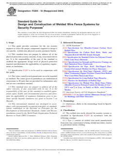 ASTM F3204-16(2024) is a guide published by ASTM International. Its full title is "Standard Guide for Design and Construction of Welded Wire Fence Systems for Security Purposes". This standard covers: SCOPE 1.1 This guide provides assistance for the site security engineer to select the proper components required to design a site-specific, welded-wire physical security perimeter barrier. 1.2 This standard does not purport to address all of the physical protection security concerns, if any, associated with its use. It is the responsibility of the user of the standard to establish the appropriate design level of physical protection required and determine the applicability of regulatory requirements or limitations. 1.3 Specification F2453 is to be used in conjunction with this guide. 1.4 The values stated in inch-pound units are to be regarded as standard. The values given in parentheses are mathematical conversions to SI units that are provided for information only and are not considered standard. 1.5 This standard does not purport to address all of the safety concerns, if any, associated with its use. It is the responsibility of the user of this standard to establish appropriate safety, health, and environmental practices and determine the applicability of regulatory limitations prior to use. Some specific hazards statements are given in Section 7 on Hazards. 1.6 This international standard was developed in accordance with internationally recognized principles on standardization established in the Decision on Principles for the Development of International Standards, Guides and Recommendations issued by the World Trade Organization Technical Barriers to Trade (TBT) Committee.