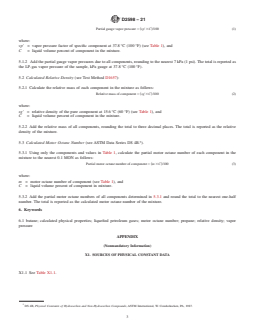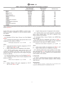 SIGNIFICANCE AND USE 4.1 Vapor pressure is an important specification property of commercial propane, special duty propane, propane/butane mixtures, and commercial butane that assures adequate vaporization, safety, and compatibility with commercial appliances. Relative density, while not a specification criterion, is necessary for determination of filling densities and custody transfer. The motor octane number (MON) is useful in determining the products' suitability as a fuel for internal combustion engines. SCOPE 1.1 This practice covers, by compositional analysis, the approximate determination of the following physical characteristics of commercial propane, special-duty propane, commercial propane/butane mixtures, and commercial butane (covered by Specification D1835): vapor pressure, relative density, and motor octane number (MON). 1.1.1 This practice is not applicable to any product exceeding specifications for nonvolatile residues. (See Test Method D2158.) 1.1.2 For calculating motor octane number, this practice is applicable only to mixtures containing 20 % or less of propene. 1.1.3 For calculated motor octane number, this practice is based on mixtures containing only components shown in Table 1. 1.2 The values stated in SI units are to be regarded as standard. 1.2.1 Exceptions: 1.2.1.1 Non-SI units in parentheses are given for information only. 1.2.1.2 Motor octane number and relative density are given in MON numbers and dimensionless units, respectively. 1.3 This international standard was developed in accordance with internationally recognized principles on standardization established in the Decision on Principles for the Development of International Standards, Guides and Recommendations issued by the World Trade Organization Technical Barriers to Trade (TBT) Committee.