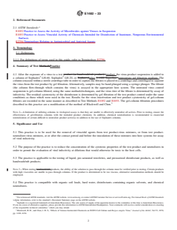 SIGNIFICANCE AND USE 5.1 This practice is to be used for the removal of virucidal agents from test product-virus mixtures, or from test product-neutralizer-virus mixtures, at or after the contact period and before the inoculation of these mixtures into host systems for assay of viral infectivity. 5.2 The purpose of the practice is to reduce the concentration of the cytotoxic properties of the test product and neutralizers in order to permit the evaluation of viral infectivity at dilutions that would otherwise be toxic to the host cells. 5.3 The practice is applicable to the testing of liquid, pre-saturated towelettes, and pressurized disinfectant products, as well as handwash/rub products. Note 3: When testing products, the ability of the solution to pass through the column must be verified prior to testing. Certain products with high viscosities are unable to pass through columns. If the product is determined to be too viscous, alternative neutralization methods should be employed. 5.4 This practice is compatible with organic soil loads, hard water, disinfectants containing organic solvents, and chemical neutralizers. SCOPE 1.1 This practice is intended to be used to reduce the cytotoxic level of the virus-test product mixture prior to assaying for viral infectivity. It is used in conjunction with evaluations of the virucidal efficacy of disinfectant solutions, wipes, trigger sprays, or pressurized disinfectant spray products intended for use on inanimate, nonporous environmental surfaces. This practice may also be used in the evaluation of hygienic handwashes/handrubs, or for other special applications. The practice may be employed with all viruses and host systems. Note 1: Gel filtration columns may impact virus titer and their use should be taken into consideration when selected for use. 1.2 This practice should be performed only by persons trained in virology techniques. 1.3 This practice utilizes gel filtration technology. The effectiveness of the practice is dependent on the ratio of gel bed volume to sample size and uniformity in the preparation of columns as well as the conditions of centrifugation. The effectiveness of this practice is maximized by investigator practice and experience with gel filtration techniques. 1.4 This practice will aid in the reduction, but not necessarily elimination, of test product toxicity while preserving the titer of the input virus. 1.5 Units—The values stated in SI units are to be regarded as standard. No other units of measurement are included in this standard. 1.6 This standard does not purport to address all of the safety concerns, if any, associated with its use. It is the responsibility of the user of this standard to establish appropriate safety, health, and environmental practices and determine the applicability of regulatory limitations prior to use. 1.7 This international standard was developed in accordance with internationally recognized principles on standardization established in the Decision on Principles for the Development of International Standards, Guides and Recommendations issued by the World Trade Organization Technical Barriers to Trade (TBT) Committee.