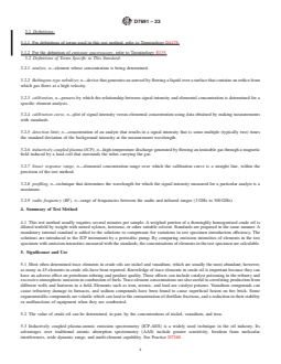 SIGNIFICANCE AND USE 5.1 Most often determined trace elements in crude oils are nickel and vanadium, which are usually the most abundant; however, as many as 45 elements in crude oils have been reported. Knowledge of trace elements in crude oil is important because they can have an adverse effect on petroleum refining and product quality. These effects can include catalyst poisoning in the refinery and excessive atmospheric emission in combustion of fuels. Trace element concentrations are also useful in correlating production from different wells and horizons in a field. Elements such as iron, arsenic, and lead are catalyst poisons. Vanadium compounds can cause refractory damage in furnaces, and sodium compounds have been found to cause superficial fusion on fire brick. Some organometallic compounds are volatile which can lead to the contamination of distillate fractions, and a reduction in their stability or malfunctions of equipment when they are combusted. 5.2 The value of crude oil can be determined, in part, by the concentrations of nickel, vanadium, and iron. 5.3 Inductively coupled plasma-atomic emission spectrometry (ICP-AES) is a widely used technique in the oil industry. Its advantages over traditional atomic absorption spectrometry (AAS) include greater sensitivity, freedom from molecular interferences, wide dynamic range, and multi-element capability. See Practice D7260. SCOPE 1.1 This test method covers the determination of several elements (including iron, nickel, sulfur, and vanadium) occurring in crude oils. 1.2 For analysis of any element using wavelengths below 190 nm, a vacuum or inert gas optical path is required. 1.3 Analysis for elements such as arsenic, selenium, or sulfur in whole crude oil may be difficult by this test method due to the presence of their volatile compounds of these elements in crude oil; but this test method should work for resid samples. 1.4 Because of the particulates present in crude oil samples, if they do not dissolve in the organic solvents used or if they do not get aspirated in the nebulizer, low elemental values may result, particularly for iron and sodium. This can also occur if the elements are associated with water which can drop out of the solution when diluted with solvent. 1.4.1 An alternative in such cases is using Test Method D5708, Procedure B, which involves wet decomposition of the oil sample and measurement by ICP-AES for nickel, vanadium, and iron, or Test Method D5863, Procedure A, which also uses wet acid decomposition and determines vanadium, nickel, iron, and sodium using atomic absorption spectrometry. 1.4.2 From ASTM Interlaboratory Crosscheck Programs (ILCP) on crude oils data available so far, it is not clear that organic solvent dilution techniques would necessarily give lower results than those obtained using acid decomposition techniques.2 1.4.3 It is also possible that, particularly in the case of silicon, low results may be obtained irrespective of whether organic dilution or acid decomposition is utilized. Silicones are present as oil field additives and can be lost in ashing. Silicates should be retained but unless hydrofluoric acid or alkali fusion is used for sample dissolution, they may not be accounted for. 1.5 This test method uses oil-soluble metals for calibration and does not purport to quantitatively determine insoluble particulates. Analytical results are particle size dependent and low results may be obtained for particles larger than a few micrometers. 1.6 The precision in Section 18 defines the concentration ranges covered in the interlaboratory study. However, lower and particularly higher concentrations can be determined by this test method. The low concentration limits are dependent on the sensitivity of the ICP instrument and the dilution factor used. The high concentration limits are determined by the product of the maximum concentration defined by the calibration curve and the sample di...