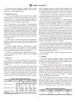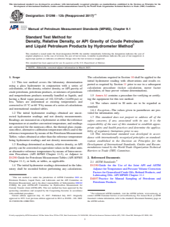 SIGNIFICANCE AND USE 5.1 Accurate determination of the density, relative density (specific gravity), or API gravity of petroleum and its products is necessary for the conversion of measured volumes to volumes or masses, or both, at the standard reference temperatures of 15 °C or 60 °F during custody transfer. 5.2 This procedure is most suitable for determining the density, relative density (specific gravity), or API gravity of low viscosity transparent liquids. This procedure can also be used for viscous liquids by allowing sufficient time for the hydrometer to reach temperature equilibrium, and for opaque liquids by employing a suitable meniscus correction. Additionally for both transparent and opaque fluids the readings shall be corrected for the thermal glass expansion effect and alternative calibration temperature effects before correcting to the reference temperature. 5.3 When used in connection with bulk oil measurements, volume correction errors are minimized by observing the hydrometer reading at a temperature close to that of the bulk oil temperature. 5.4 Density, relative density, or API gravity is a factor governing the quality and pricing of crude petroleum. However, this property of petroleum is an uncertain indication of its quality unless correlated with other properties. 5.5 Density is an important quality indicator for automotive, aviation and marine fuels, where it affects storage, handling and combustion. SCOPE 1.1 This test method covers the laboratory determination using a glass hydrometer in conjunction with a series of calculations, of the density, relative density, or API gravity of crude petroleum, petroleum products, or mixtures of petroleum and nonpetroleum products normally handled as liquids, and having a Reid vapor pressure of 101.325 kPa (14.696 psi) or less. Values are determined at existing temperatures and corrected to 15 °C or 60 °F by means of a series of calculations and international standard tables. 1.2 The initial hydrometer readings obtained are uncorrected hydrometer readings and not density measurements. Readings are measured on a hydrometer at either the reference temperature or at another convenient temperature, and readings are corrected for the meniscus effect, the thermal glass expansion effect, alternative calibration temperature effects and to the reference temperature by means of the Petroleum Measurement Tables; values obtained at other than the reference temperature being hydrometer readings and not density measurements. 1.3 Readings determined as density, relative density, or API gravity can be converted to equivalent values in the other units or alternative reference temperatures by means of Interconversion Procedures (API MPMS Chapter 11.5), or Adjunct to D1250 Guide for Petroleum Measurement Tables (API MPMS Chapter 11.1), or both, or tables, as applicable. 1.4 The initial hydrometer readings determined in the laboratory shall be recorded before performing any calculations. The calculations required in Section 10 shall be applied to the initial hydrometer reading with observations and results reported as required by Section 11 prior to use in a subsequent calculation procedure (ticket calculation, meter factor calculation, or base prover volume determination). 1.5 Annex A1 contains a procedure for verifying or certifying the equipment for this test method. 1.6 The values stated in SI units are to be regarded as standard. 1.6.1 Exception—The values given in parentheses are provided for information only. 1.7 This standard does not purport to address all of the safety concerns, if any, associated with its use. It is the responsibility of the user of this standard to establish appropriate safety and health practices and determine the applicability of regulatory limitations prior to use. 1.8 This international standard was developed in accordance with internationally recognized principles on standardization established in th...