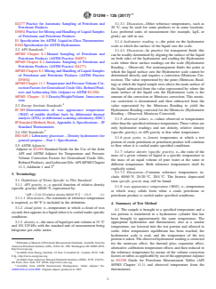ASTM D1298-12b(2017)e1 is a standard published by ASTM International. Its full title is "Standard Test Method for Density, Relative Density, or API Gravity of Crude Petroleum and Liquid Petroleum Products by Hydrometer Method". This standard covers: SIGNIFICANCE AND USE 5.1 Accurate determination of the density, relative density (specific gravity), or API gravity of petroleum and its products is necessary for the conversion of measured volumes to volumes or masses, or both, at the standard reference temperatures of 15 °C or 60 °F during custody transfer. 5.2 This procedure is most suitable for determining the density, relative density (specific gravity), or API gravity of low viscosity transparent liquids. This procedure can also be used for viscous liquids by allowing sufficient time for the hydrometer to reach temperature equilibrium, and for opaque liquids by employing a suitable meniscus correction. Additionally for both transparent and opaque fluids the readings shall be corrected for the thermal glass expansion effect and alternative calibration temperature effects before correcting to the reference temperature. 5.3 When used in connection with bulk oil measurements, volume correction errors are minimized by observing the hydrometer reading at a temperature close to that of the bulk oil temperature. 5.4 Density, relative density, or API gravity is a factor governing the quality and pricing of crude petroleum. However, this property of petroleum is an uncertain indication of its quality unless correlated with other properties. 5.5 Density is an important quality indicator for automotive, aviation and marine fuels, where it affects storage, handling and combustion. SCOPE 1.1 This test method covers the laboratory determination using a glass hydrometer in conjunction with a series of calculations, of the density, relative density, or API gravity of crude petroleum, petroleum products, or mixtures of petroleum and nonpetroleum products normally handled as liquids, and having a Reid vapor pressure of 101.325 kPa (14.696 psi) or less. Values are determined at existing temperatures and corrected to 15 °C or 60 °F by means of a series of calculations and international standard tables. 1.2 The initial hydrometer readings obtained are uncorrected hydrometer readings and not density measurements. Readings are measured on a hydrometer at either the reference temperature or at another convenient temperature, and readings are corrected for the meniscus effect, the thermal glass expansion effect, alternative calibration temperature effects and to the reference temperature by means of the Petroleum Measurement Tables; values obtained at other than the reference temperature being hydrometer readings and not density measurements. 1.3 Readings determined as density, relative density, or API gravity can be converted to equivalent values in the other units or alternative reference temperatures by means of Interconversion Procedures (API MPMS Chapter 11.5), or Adjunct to D1250 Guide for Petroleum Measurement Tables (API MPMS Chapter 11.1), or both, or tables, as applicable. 1.4 The initial hydrometer readings determined in the laboratory shall be recorded before performing any calculations. The calculations required in Section 10 shall be applied to the initial hydrometer reading with observations and results reported as required by Section 11 prior to use in a subsequent calculation procedure (ticket calculation, meter factor calculation, or base prover volume determination). 1.5 Annex A1 contains a procedure for verifying or certifying the equipment for this test method. 1.6 The values stated in SI units are to be regarded as standard. 1.6.1 Exception—The values given in parentheses are provided for information only. 1.7 This standard does not purport to address all of the safety concerns, if any, associated with its use. It is the responsibility of the user of this standard to establish appropriate safety and health practices and determine the applicability of regulatory limitations prior to use. 1.8 This international standard was developed in accordance with internationally recognized principles on standardization established in th...