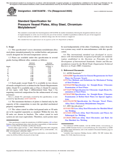 ASTM A387/A387M-17a(2023) is a technical specification published by ASTM International. Its full title is "Standard Specification for Pressure Vessel Plates, Alloy Steel, Chromium-Molybdenum". This standard covers: ABSTRACT This specification covers chromium-molybdenum alloy steel plates for welded broilers and pressure vessels designed for elevated temperature service. Materials considered under this specification are available in grades 2, 12, 11, 22, 22L, 21, 21L, 5, 9 and 91. The steel materials shall be killed and shall be thermally treated. The steel specimens shall undergo heat analysis and product analysis and shall conform to the chemical requirements for carbon, manganese, phosphorus, sulfur, silicon, chromium, molybdenum, nickel, vanadium, columbium, boron, nitrogen, aluminum, titanium, and zirconium. The steel specimens shall also undergo tension tests and shall conform to the required values of tensile strength, yield strength, and elongation. SCOPE 1.1 This specification2 covers chromium-molybdenum alloy steel plates intended primarily for welded boilers and pressure vessels designed for elevated temperature service. 1.2 Plates are available under this specification in several grades having different alloy contents as follows: Nominal Nominal Chromium Molybdenum Grade Content, % Content, % 2 0.50 0.50 12 1.00 0.50 11 1.25 0.50 22 2.25 1.00 21 3.00 1.00 5 5.00 0.50 9 9.00 1.00 91 9.00 1.00 1.3 Each grade except Grade 91 is available in two classes of tensile strength levels as defined in the Tensile Requirements tables. Grade 91 is available only as Class 2. Grade 91 consists of two types, with Type 2 differentiated from Type 1 by requiring restricted composition for the enhancement of creep resistance. Note 1: Grade 911, previously covered by this specification, is now covered by Specification A1017/A1017M. 1.4 The maximum thickness of plates is limited only by the capacity of the composition to meet the specified mechanical property requirements. 1.5 The values stated in either inch-pound units or SI units are to be regarded separately as standard. Within the text, the SI units are shown in brackets. The values stated in each system are not exact equivalents. Therefore, each system must be used independently of the other. Combining values from the two systems may result in nonconformance with this specification. 1.6 This international standard was developed in accordance with internationally recognized principles on standardization established in the Decision on Principles for the Development of International Standards, Guides and Recommendations issued by the World Trade Organization Technical Barriers to Trade (TBT) Committee.