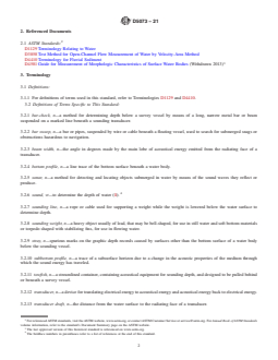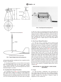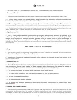 SIGNIFICANCE AND USE 5.1 This is a general practice intended to give direction in the selection of depth measuring procedures and equipment for use under a wide range of conditions encountered in surface water bodies. Physical conditions at the measuring site, the quality of data required, and the availability of appropriate measuring equipment govern the selection process. A step-by-step procedure for actually obtaining a depth measurement is not discussed. This practice is to be used in conjunction with a practice on positioning techniques and another practice on bathymetric survey procedures to obtain horizontal location and bottom elevations of points on a water body. SCOPE 1.1 This practice guides the user in selection of procedures commonly used to measure depth in water bodies that are as follows: Sections Procedure A—Manual Measurement 6 through 11 Procedure B—Electronic Sonic-Echo Sounding 12 through 13 Procedure C—Electronic Nonacoustic Measurement 14 through 15 The text specifies depth measuring terminology, describes measurement of depth by manual and electronic equipment, outlines specific uses of electronic sounders, and describes an electronic procedure for depth measurement other than using sonar. 1.2 The references cited and listed at the end of this practice contain information that may help in the design of a high quality measurement program. 1.3 The information provided on depth measurement is descriptive in nature and not intended to endorse any particular item of manufactured equipment or procedure. 1.4 This practice pertains to depth measurement in quiescent or low-velocity flow. For depth measurement related to stream gauging, see Test Method D3858. For depth measurements related to reservoir surveys, see Guide D4581. 1.5 The values stated in inch-pound units are to be regarded as standard. The values given in parentheses are mathematical conversions to SI units that are provided for information only and are not considered standard. 1.6 This standard does not purport to address all of the safety concerns, if any, associated with its use. It is the responsibility of the user of this standard to establish appropriate safety, health, and environmental practices and determine the applicability of regulatory limitations prior to use. 1.7 This international standard was developed in accordance with internationally recognized principles on standardization established in the Decision on Principles for the Development of International Standards, Guides and Recommendations issued by the World Trade Organization Technical Barriers to Trade (TBT) Committee.