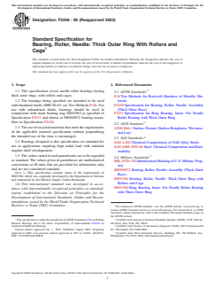 ASTM F2246-06(2022) is a technical specification published by ASTM International. Its full title is "Standard Specification for Bearing, Roller, Needle: Thick Outer Ring With Rollers and Cage". This standard covers: SCOPE 1.1 This specification covers needle roller bearings having thick outer rings, with rollers and cages. 1.2 The bearings being specified are intended to be used with hardened shafts (HRC58-65; see Test Methods E18). For use with unhardened shafts, bearings should be used in conjunction with inner bearing ring MS51962 as specified in Specification F2431 and shown as MS500072 bearing assemblies in Specification F2430. 1.3 The use of recycled materials that meet the requirements of the applicable material specification without jeopardizing the intended use of the item is encouraged. 1.4 Bearings designed to this specification are intended for use in applications requiring high radial load with minimal angular shaft misalignment. 1.5 The values stated in inch-pound units are to be regarded as standard. The values given in parentheses are mathematical conversions to SI units that are provided for information only and are not considered standard. Note 1: This specification contains many of the requirements of MS51961 which was originally developed by the Department of Defense and maintained by the Defense Supply Center Richmond. 1.6 This international standard was developed in accordance with internationally recognized principles on standardization established in the Decision on Principles for the Development of International Standards, Guides and Recommendations issued by the World Trade Organization Technical Barriers to Trade (TBT) Committee.