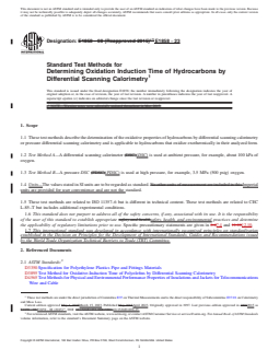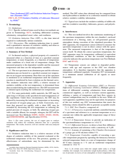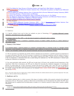 SIGNIFICANCE AND USE 5.1 Oxidative induction time is a relative measure of the degree of oxidative stability of the material evaluated at the isothermal temperature of the test. The presence, quantity or effectiveness of antioxidants may be determined by this method. The OIT values thus obtained may be compared from one hydrocarbon to another or to a reference material to obtain relative oxidative stability information. 5.2 Typical uses include the oxidative stability of edible oils and fats (oxidative rancidity), lubricants, greases, and polyolefins. SCOPE 1.1 These test methods describe the determination of the oxidative properties of hydrocarbons by differential scanning calorimetry or pressure differential scanning calorimetry and is applicable to hydrocarbons that oxidize exothermically in their analyzed form. 1.2 Test Method A—A differential scanning calorimeter (DSC) is used at ambient pressure, for example, about 100 kPa of oxygen. 1.3 Test Method B—A pressure DSC (PDSC) is used at high pressure, for example, 3.5 MPa (500 psig) oxygen. 1.4 Units—The values stated in SI units are to be regarded as standard. Imperial units are provided for user convenience and are not the standard. 1.5 These test methods are related to ISO 11357–6 but is different in technical content. These test methods are related to CEC L-85–T but includes additional experimental conditions. 1.6 This standard does not purport to address all of the safety concerns, if any, associated with its use. It is the responsibility of the user of this standard to establish appropriate safety, health, and environmental practices and determine the applicability of regulatory limitations prior to use. Specific precautionary statements are given in 7.4 and 12.10. 1.7 This international standard was developed in accordance with internationally recognized principles on standardization established in the Decision on Principles for the Development of International Standards, Guides and Recommendations issued by the World Trade Organization Technical Barriers to Trade (TBT) Committee.