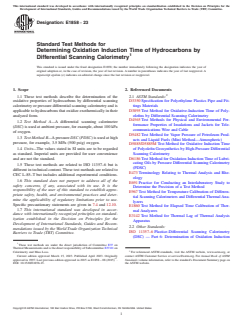 ASTM E1858-23 is a standard published by ASTM International. Its full title is "Standard Test Methods for Determining Oxidation Induction Time of Hydrocarbons by Differential Scanning Calorimetry". This standard covers: SIGNIFICANCE AND USE 5.1 Oxidative induction time is a relative measure of the degree of oxidative stability of the material evaluated at the isothermal temperature of the test. The presence, quantity or effectiveness of antioxidants may be determined by this method. The OIT values thus obtained may be compared from one hydrocarbon to another or to a reference material to obtain relative oxidative stability information. 5.2 Typical uses include the oxidative stability of edible oils and fats (oxidative rancidity), lubricants, greases, and polyolefins. SCOPE 1.1 These test methods describe the determination of the oxidative properties of hydrocarbons by differential scanning calorimetry or pressure differential scanning calorimetry and is applicable to hydrocarbons that oxidize exothermically in their analyzed form. 1.2 Test Method A—A differential scanning calorimeter (DSC) is used at ambient pressure, for example, about 100 kPa of oxygen. 1.3 Test Method B—A pressure DSC (PDSC) is used at high pressure, for example, 3.5 MPa (500 psig) oxygen. 1.4 Units—The values stated in SI units are to be regarded as standard. Imperial units are provided for user convenience and are not the standard. 1.5 These test methods are related to ISO 11357–6 but is different in technical content. These test methods are related to CEC L-85–T but includes additional experimental conditions. 1.6 This standard does not purport to address all of the safety concerns, if any, associated with its use. It is the responsibility of the user of this standard to establish appropriate safety, health, and environmental practices and determine the applicability of regulatory limitations prior to use. Specific precautionary statements are given in 7.4 and 12.10. 1.7 This international standard was developed in accordance with internationally recognized principles on standardization established in the Decision on Principles for the Development of International Standards, Guides and Recommendations issued by the World Trade Organization Technical Barriers to Trade (TBT) Committee.