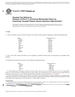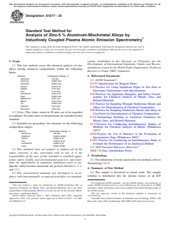 ASTM E1277-23 is the standard test method developed by ASTM International for the chemical analysis of zinc-5% aluminum-mischmetal alloys using inductively coupled plasma atomic emission spectrometry (ICP-AES). This method is designed primarily to ensure alloys meet compositional specifications, supporting quality control and regulatory compliance in the metallurgical and manufacturing industries. The procedure is intended for use by trained analysts in properly equipped laboratories, offering precise and reliable elemental analysis for critical applications.