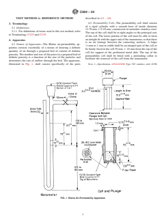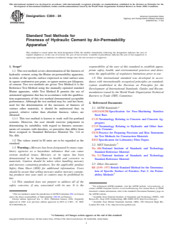 ABSTRACT This test method covers determination of the fineness of hydraulic cement, using the Blaine air-permeability apparatus, in terms of the specific surface expressed as total surface area in square centimetres per gram, or square metres per kilogram, of cement. Two test methods are given: test method A is the reference test method using the manually operated standard Blaine apparatus, while test method B permits the use of automated apparatus that has in accordance with the qualification requirements of this test method demonstrated acceptable performance. The Blaine air-permeability apparatus consists essentially of a means of drawing a definite quantity of air through a prepared bed of cement of definite porosity. The permeability cell shall consist of a rigid cylinder, constructed of austenitic stainless steel. The disk shall be constructed of noncorroding metal, and shall fit the inside of the cell snugly. The plunger shall be constructed of austenitic stainless steel and shall fit into the cell. The filter paper disks shall be circular, with smooth edges, and shall have the same diameter as the inside of the cell. The U-tube manometer shall be constructed according to the design indicated. The manometer shall be filled to the midpoint line with a nonvolatile, nonhygroscopic liquid of low viscosity and density. The timer shall have a positive starting and stopping mechanism. The calibration of the air permeability apparatus shall be made using the standard reference material. The automated test method shall employ apparatus designed either on the principles of the Blaine air-permeability method or apparatus based on the air-permeability principles of the Lea and Nurse method. When the specific surface values determined by an automated apparatus are to be used for acceptance or rejection of cement, the method used shall comply with the qualification requirements. When standardization is required in order to achieve agreement between test method A and test method B, the apparatus shall be standardized according to the requirements prescribed. SCOPE 1.1 This test method covers determination of the fineness of hydraulic cement, using the Blaine air-permeability apparatus, in terms of the specific surface expressed as total surface area in square centimetres per gram, or square metres per kilogram, of cement. Two test methods are given: Test Method A is the Reference Test Method using the manually operated standard Blaine apparatus, while Test Method B permits the use of automated apparatus that has in accordance with the qualification requirements of this test method demonstrated acceptable performance. Although the test method may be, and has been, used for the determination of the measures of fineness of various other materials, it should be understood that, in general, relative rather than absolute fineness values are obtained. 1.1.1 This test method is known to work well for portland cements. However, the user should exercise judgement in determining its suitability with regard to fineness measurements of cements with densities, or porosities that differ from those assigned to Standard Reference Material No. 114 or No. 46h. 1.2 The values stated in SI units are to be regarded as the standard. 1.3 Warning—Mercury has been designated by many regulatory agencies as a hazardous substance that can cause serious medical issues. Mercury, or its vapor, has been demonstrated to be hazardous to health and corrosive to materials. Caution should be taken when handling mercury and mercury containing products. See the applicable product Safety Data Sheet (SDS) for additional information. Users should be aware that selling mercury and/or mercury containing products into your state or country may be prohibited by law. 1.4 This standard does not purport to address all of the safety concerns, if any, associated with its use. It is the responsibility of the user of this standard to establish appropriate safe...