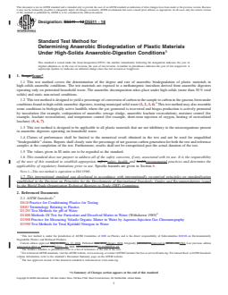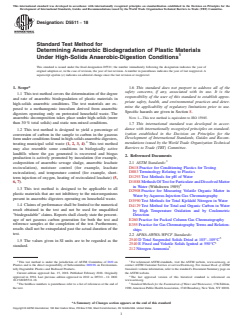 SIGNIFICANCE AND USE 5.1 Biodegradation of a plastic within a high-solids anaerobic digestion unit is an important phenomenon because it will affect the decomposition of other waste materials enclosed by the plastic and the resulting quality and appearance of the digestate after an anaerobic digestion process. Biodegradation of plastics could allow for the safe disposal of these plastics through aerobic and anaerobic solid-waste-treatment plants. This procedure has been developed to permit the determination of the rate and degree of anaerobic biodegradability of plastic products when placed in a high-solids anaerobic digester for the production of digestate from municipal solid waste. 5.2 Limitations—Because there is a wide variation in the construction and operation of anaerobic-digestion systems and because regulatory requirements for composting systems vary, this procedure is not intended to simulate the environment of any particular high-solids anaerobic-digestion system. However, it is expected to resemble the environment of a high-solids anaerobic-digestion process operated under optimum conditions. More specifically, the procedure is intended to create a standard laboratory environment that will permit a rapid and reproducible determination of the anaerobic biodegradability under high-solids digestion conditions. SCOPE 1.1 This test method covers the determination of the degree and rate of anaerobic biodegradation of plastic materials in high-solids anaerobic conditions. The test materials are exposed to a methanogenic inoculum derived from anaerobic digesters operating only on pretreated household waste. The anaerobic decomposition takes place under high-solids (more than 30 % total solids) and static non-mixed conditions. 1.2 This test method is designed to yield a percentage of conversion of carbon in the sample to carbon in the gaseous form under conditions found in high-solids anaerobic digesters, treating municipal solid waste (1, 2, 3, 4).2 This test method may also resemble some conditions in biologically active landfills where the gas generated is recovered and biogas production is actively promoted by inoculation (for example, codeposition of anaerobic sewage sludge, anaerobic leachate recirculation), moisture control (for example, leachate recirculation), and temperature control (for example, short-term injection of oxygen, heating of recirculated leachate) (5, 6, 7). 1.3 This test method is designed to be applicable to all plastic materials that are not inhibitory to the microorganisms present in anaerobic digesters operating on household waste. 1.4 Claims of performance shall be limited to the numerical result obtained in the test and not be used for unqualified “biodegradable” claims. Reports shall clearly state the percentage of net gaseous carbon generation for both the test and reference samples at the completion of the test. Furthermore, results shall not be extrapolated past the actual duration of the test. 1.5 The values given in SI units are to be regarded as the standard. 1.6 This standard does not purport to address all of the safety concerns, if any, associated with its use. It is the responsibility of the user of this standard to establish appropriate safety, health, and environmental practices and determine the applicability of regulatory limitations prior to use. Specific hazards are given in Section 8. Note 1: This test method is equivalent to ISO 15985. 1.7 This international standard was developed in accordance with internationally recognized principles on standardization established in the Decision on Principles for the Development of International Standards, Guides and Recommendations issued by the World Trade Organization Technical Barriers to Trade (TBT) Committee.