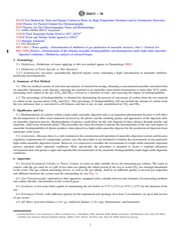 1.2 This test method is designed to yield a percentage of conversion of carbon in the sample to carbon in the gaseous form under conditions found in high-solids anaerobic digesters, treating municipal solid waste (1, 2, 3, 4).2 This test method may also resemble some conditions in biologically active landfills where the gas generated is recovered and biogas production is actively promoted by inoculation (for example, codeposition of anaerobic sewage sludge, anaerobic leachate recirculation), moisture control (for example, leachate recirculation), and temperature control (for example, short-term injection of oxygen, heating of recirculated leachate) (5, 6, 7).