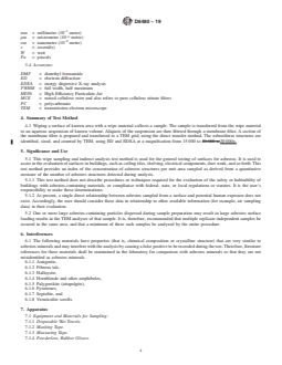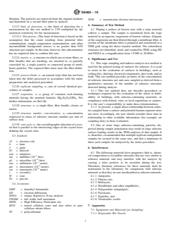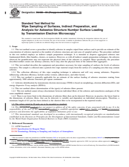 SIGNIFICANCE AND USE 5.1 This wipe sampling and indirect analysis test method is used for the general testing of surfaces for asbestos. It is used to assist in the evaluation of surfaces in buildings, such as ceiling tiles, shelving, electrical components, duct work, and so forth. This test method provides an index of the concentration of asbestos structures per unit area sampled as derived from a quantitative measure of the number of asbestos structures detected during analysis. 5.1.1 This test method does not describe procedures or techniques required for the evaluation of the safety or habitability of buildings with asbestos-containing materials, or compliance with federal, state, or local regulations or statutes. It is the user's responsibility to make these determinations. 5.1.2 At present, a single direct relationship between asbestos sampled from a surface and potential human exposure does not exist. Accordingly, the user should consider these data in relationship to other available information (for example, air sampling data) in their evaluation. 5.2 One or more large asbestos-containing particles dispersed during sample preparation may result in large asbestos surface loading results in the TEM analyses of that sample. It is, therefore, recommended that multiple replicate independent samples be secured in the same area, and that a minimum of three such samples be analyzed by the entire procedure. SCOPE 1.1 This test method covers a procedure to identify asbestos in samples wiped from surfaces and to provide an estimate of the concentration of asbestos reported as the number of asbestos structures per unit area of sampled surface. The procedure outlined in this test method employs an indirect sample preparation technique. It is intended to disperse aggregated asbestos into fundamental fibrils, fiber bundles, clusters, or matrices. However, as with all indirect sample preparation techniques, the asbestos observed for quantification may not represent the physical form of the asbestos as sampled. More specifically, the procedure described neither creates nor destroys asbestos, but it may alter the physical form of the mineral fiber aggregates. 1.2 This test method describes the equipment and procedures necessary for wipe sampling of surfaces for levels of asbestos structures. The sample is collected onto a particle-free wipe material (wipe) from the surface of a sampling area that may contain asbestos. 1.2.1 The collection efficiency of this wipe sampling technique is unknown and will vary among substrates. Properties influencing collection efficiency include surface texture, adhesiveness, and other factors. 1.2.2 This test method is generally applicable for an estimate of the surface loading of asbestos structures starting from approximately 1000 asbestos structures per square centimetre. 1.3 Asbestos identification by transmission electron microscopy (TEM) is based on morphology, electron diffraction (ED), and energy dispersive X-ray analysis (EDXA). 1.4 This test method allows determination of the type(s) of asbestos fibers present. 1.4.1 This test method cannot always discriminate between individual fibers of the asbestos and nonasbestos analogues of the same amphibole mineral. 1.4.2 There is no lower limit to the dimensions of asbestos fibers that can be detected. However, in practice, the lower limit to the dimensions of asbestos fibers, that can be detected, is variable and dependent on individual microscopists. Therefore, a minimum length of 0.5 μm has been defined as the shortest fiber to be incorporated in the reported results. 1.5 The values stated in SI units are to be regarded as standard. 1.6 This standard does not purport to address all of the safety concerns, if any, associated with its use. It is the responsibility of the user of this standard to establish appropriate safety, health, and environmental practices and determine the applicability of regulator...