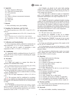 SIGNIFICANCE AND USE 5.1 It is generally recognized that excess moisture and air within an interlayer will cause bubble formation in a laminate when exposed to heat or UV radiation, or both. These may be caused by initial moisture and air in the interlayer and be generated by thermal exposure. The purpose of this test method is to measure quantitatively the laminate stability under controlled conditions, specifically in relation to the formation of bubbles in the body of the laminate. 5.2 Subjecting the laminated glazing to extended heat at a controlled temperature and time provides the excess moisture and air which are forced into the interlayer during processing to surface as bubbles. This occurs only if there are excess moisture and air trapped in between the glass. Therefore, making these thermal tests efficient to determine proper de-airing of laminated glass products. 5.3 This test method provides a means to visually determine if discoloration has or is occurring and serves as a pass/fail test for some aspects of lamination quality. 5.4 This test method can be performed after natural or accelerated exposure to determine if there are changes to the polymer such as the stability with high temperature which is useful for understanding the visual stability of installed glazing. 5.5 This test method does not provide an indication of laminated glass capability for impact resistance, glass shard retention on breakage or edge stability of laminated glass. SCOPE 1.1 The purpose of this test method is to measure quantitatively the laminate stability under controlled conditions, specifically in relation to the formation of bubbles in a laminate with heat exposure. 1.2 This test method can be performed on laminates which have been exposed to weathering or as manufactured samples to determine the amount of excess air dissolved in the interlayer. 1.3 This test method determines the stability of laminated glass when subjected to high heat environments. 1.4 This test method outlines a procedure to be used on laminated glass with two or more layers of glass bonded by an interlayer. 1.5 This test method covers visual rating of tested specimens. 1.6 The values stated in SI units are to be regarded as standard. The values given in parentheses after SI units are provided for information only and are not considered standard. 1.7 This standard does not purport to address all of the safety concerns, if any, associated with its use. It is the responsibility of the user of this standard to establish appropriate safety, health, and environmental practices and determine the applicability of regulatory limitations prior to use. 1.8 This international standard was developed in accordance with internationally recognized principles on standardization established in the Decision on Principles for the Development of International Standards, Guides and Recommendations issued by the World Trade Organization Technical Barriers to Trade (TBT) Committee.