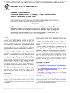 SIGNIFICANCE AND USE 5.1 The speech privacy between locations in an open plan space is determined by the degree to which intruding speech sounds exceed the ambient sound pressure levels at the listener's ear; a classic signal-to-noise ratio situation. 5.2 The sound pressure levels at the listener's ear from intruding speech depend upon: 5.2.1 The individual vocal effort and orientation of the talker, 5.2.2 The attenuation of speech signals due to distance or intervening barriers, and 5.2.3 The reinforcement of speech signals due to reflections from surfaces such as the ceiling, furniture panels, light fixtures, walls, or windows. 5.3 The ambient sound levels within a space often must be increased in order to mask intruding speech using an electronic sound masking system. However, in certain locations and in specific frequency ranges, the building mechanical, electrical and plumbing (MEP) equipment, and the heating, ventilating, or air conditioning equipment (HVAC) may increase ambient sound levels or add tonal noise components that may require mitigation before tuning the masking sound. 5.4 The primary purpose of this test method is to assess the speech privacy for an average speech spectrum using the standard Articulation Index method. This requires measurement of the relevant acoustical characteristics discussed in 5.2 and 5.3 for a pair of locations and calculation of the Articulation Index using an average speech spectrum. The average speech spectrum is for male talkers speaking with normal voice effort. In specific cases such as designated quiet work zones for ‘focused work’ where administrative measures have been taken to reduce speech levels, a ‘casual’ voice spectrum should be used to calculate speech privacy, whereas in designated group work zones for ‘collaborative work’ where lively discussion is expected, a ‘raised’ voice spectrum should be used to calculate speech privacy. 5.5 The Articulation Index ranges from a low value of 0.00, where speech is gener... SCOPE 1.1 This test method describes a means of objectively assessing speech privacy between locations in open plan spaces. This test method relies upon acoustical measurements, published information on speech levels, and standard methods for assessing speech communication. This test method does not measure the performance of individual open plan components which affect speech privacy; but rather, it assesses the privacy which results from a particular configuration of components (1, 2).2 1.2 This test method is intended to be a field test for the assessment of speech privacy in actual open plan spaces. However, this test method could be used in mock-up spaces and in environments arranged to simulate an open plan space. 1.3 This test method is suitable for use in many open plan spaces including traditional open offices, focus areas, and collaboration spaces. In addition to office buildings, these types of spaces will also be found in healthcare buildings, institutional spaces, schools, etc. It is not directly applicable for measuring the speech privacy between open plan and enclosed spaces or between fully enclosed spaces. 1.4 This test method relies upon the Articulation Index, which objectively predicts the intelligibility of speech. While both the Articulation Index and this test method can be expected to reliably predict speech privacy, neither predicts the specific effective speech privacy afforded to particular individual occupants. 1.5 The values stated in SI units are to be regarded as the standard. The inch-pound units in parentheses are for information only. 1.6 This standard does not purport to address all of the safety concerns, if any, associated with its use. It is the responsibility of the user of this standard to establish appropriate safety, health, and environmental practices and determine the applicability of regulatory limitations prior to use. 1.7 This international standard was developed...
