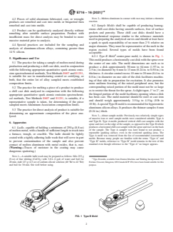 SIGNIFICANCE AND USE 5.1 The practice for taking a sample of molten metal during production and producing a chill cast disk, used in conjunction with the following appropriate quantitative spark atomic emission spectrochemical methods, Test Methods E607 and E1251, is suitable for use in manufacturing control or certifying, or both, that the entire lot of alloy sampled meets established composition limits. 5.2 The practice for melting a piece of a product to produce a chill cast disk analyzed in conjunction with the following appropriate quantitative spark atomic emission spectrochemical methods, Test Methods E607 and E1251, is suitable, if a representative sample is taken, for determining if the piece sampled meets Aluminum Association composition limits. 5.3 The practice for direct analysis of product is suitable for determining an approximate composition of the piece analyzed. SCOPE 1.1 These practices describe procedures for producing a chill cast disk sample from molten aluminum during the production process, and from molten metal produced by melting pieces cut from products. 1.2 These practices describe a procedure for obtaining qualitative results by direct analysis of product using spark atomic emission spectrometry. 1.3 These practices describe procedures for preparation of samples and products prior to analysis. 1.4 The values stated in SI units are to be regarded as standard. The values given in parentheses are mathematical conversions to inch-pound units that are provided for information only and are not considered standard. 1.5 This standard does not purport to address all of the safety concerns, if any, associated with its use. It is the responsibility of the user of this standard to establish appropriate safety, health, and environmental practices and determine the applicability of regulatory limitations prior to use. Specific precautionary statements are given in 6.1 and 7.2. 1.6 This international standard was developed in accordance with internationally recognized principles on standardization established in the Decision on Principles for the Development of International Standards, Guides and Recommendations issued by the World Trade Organization Technical Barriers to Trade (TBT) Committee.
