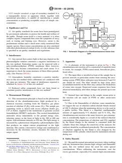 ASTM D5149-02(2016) is a standard published by ASTM International. Its full title is "Standard Test Method for Ozone in the Atmosphere: Continuous Measurement by Ethylene Chemiluminescence". This standard covers: SIGNIFICANCE AND USE 4.1 Air quality standards for ozone have been promulgated by government authorities to protect the health and welfare of the public. Though ozone itself is a toxic material, it is often complex organic compounds that cause the symptoms of smog such as tearing and burning eyes. However, ozone is the predominant oxidant and is much more easily monitored than organic species. Since ozone concentrations are also correlated with other photochemical oxidant levels, it is the substance that is specified in air quality standards and regulations. SCOPE 1.1 This test method describes the sampling and continuous analysis of the ozone content of the atmosphere at concentrations of 20 to 2000 μg of ozone/m3 (10 ppb (v) to 1 ppm (v)). 1.2 This test method is limited in application by its sensitivity to interferences as described below. This test method is not suitable for personal sampling because of instrument size and sensitivity to vibration and ambient temperature. 1.3 This standard does not purport to address all of the safety concerns, if any, associated with its use. It is the responsibility of the user of this standard to establish appropriate safety and health practices and determine the applicability of regulatory limitations prior to use. Some specific precautionary statements are presented in Section 8.