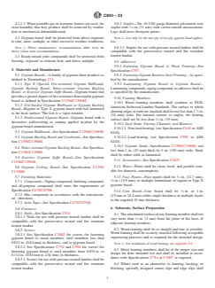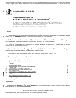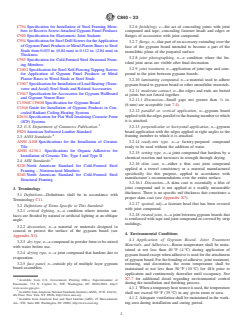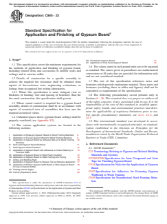 ASTM C840-23: Standard Specification for Application and Finishing of Gypsum Board is the authoritative guide developed by ASTM International for best practices in the installation and finishing of gypsum board in construction projects. This standard covers both interior and select exterior (soffit) applications, ensuring that gypsum board assemblies meet essential criteria for fire resistance, sound control, structural integrity, and aesthetics. The document is widely referenced across the building industry, setting minimum requirements for application methods, finishing systems, materials, and environmental conditions.