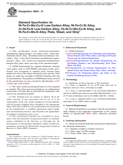 ASTM B625-21 is a technical specification published by ASTM International. Its full title is "Standard Specification for Ni-Fe-Cr-Mo-Cu-N Low-Carbon Alloy, Ni-Fe-Cr-Si Alloy, <brk />Cr-Ni-Fe-N Low-Carbon Alloy, Fe-Ni-Cr-Mo-Cu-N Alloy, and <brk/>Ni-Fe-Cr-Mo-N Alloy Plate, Sheet, and Strip". This standard covers: ABSTRACT This specification covers alloys UNS N08925, UNS N08031, UNS N08932, UNS N08926, UNS N08354, and UNS R20033 plate, sheet, and strip in the annealed temper. The alloys shall conform to the required chemical composition such as carbon, manganese, phosphorus, sulfur, silicon, nickel, chromium, molybdenum, copper, nitrogen, and iron. The alloys shall also conform to the required mechanical properties such as tensile strength, yield strength, elongation, and Rockwell hardness. SCOPE 1.1 This specification covers nickel-iron-chromium-molybdenum-copper-nitrogen low-carbon alloy, nickel-iron-chromium-silicon alloy, chromium-nickel-iron-nitrogen low-carbon alloy, iron-nickel-chromium-molybdenum-copper-nitrogen alloy, and nickel-iron-chromium-molybdenum-nitrogen alloy plate, sheet, and strip in the annealed temper. 1.2 ASTM International has adopted definitions whereby some grades, such as UNS N08904, previously in this specification were recognized as stainless steels, because those grades have iron as the largest element by mass percent. Such grades are under the oversight of ASTM Committee A01 and its subcommittees. The products of N08904 previously covered in this specification are now covered by Specifications A240/A240M and A480/A480M. 1.3 The values stated in inch-pound units are to be regarded as standard. The values given in parentheses are mathematical conversions to SI units that are provided for information only and are not considered standard. 1.4 This standard does not purport to address all of the safety concerns, if any, associated with its use. It is the responsibility of the user of this standard to become familiar with all hazards including those identified in the appropriate Safety Data Sheet (SDS) for this product/material as provided by the manufacturer, to establish appropriate safety, health, and environmental practices, and determine the applicability of regulatory limitations prior to use. 1.5 This international standard was developed in accordance with internationally recognized principles on standardization established in the Decision on Principles for the Development of International Standards, Guides and Recommendations issued by the World Trade Organization Technical Barriers to Trade (TBT) Committee.