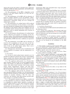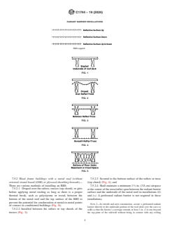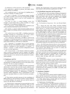 SIGNIFICANCE AND USE 4.1 In this practice it is recognized that effectiveness, safety, and durability of an RBS depends not only on the quality of the materials, but also on proper installation. 4.2 Improper installation of an RBS will reduce the thermal effectiveness, cause fire risks and other unsafe conditions, and promote deterioration of the structure in which it is installed. Improper installations include fires caused by: (1) heat buildup in recessed lighting fixtures, (2) deterioration or failure of electrical wiring components, and (3) deterioration in wood structures and paint failure as a result of moisture accumulation. 4.3 This practice provides direction for the installation of RBS products in a safe and effective manner. Actual conditions in existing buildings vary greatly and care shall be taken to ensure safe and effective installation. 4.4 In this practice, requirements are presented that are both general and specific in nature and practical. They are not intended as specific instructions unless so indicated. The user shall consult the manufacturer for application and installation methods. The requirements in this practice shall be the minimum material and installation requirements for RBS. SCOPE 1.1 This practice has been prepared for use by the designer, specifier, builder, and the installer of radiant barrier systems (RBS) for use in commercial/industrial building construction not otherwise restricted from use. The scope is limited to instruction relative to the use and installation of RBS, including a surface(s) normally having an emittance of 0.1 or less, such as metallic foil or metallic foil deposits, mounted on substrates. Some examples that this practice is intended to address include: (1) low-emittance surfaces in vented building envelope cavities intended to retard radiant transfer across the airspace: (2) low-emittance surfaces at interior building surfaces intended to retard radiant transfer to, or from, building inhabitants; and (3) low-emittance surface at interior building surfaces intended to reduce radiant transfer to, or from, radiant heating or cooling systems. 1.2 This practice covers the installation process from pre-installation inspection through the post-installation procedure. It does not cover the production of the radiant barrier materials. (See Specification C1313.) 1.3 This practice is not intended to replace the manufacturer’s installation instructions but shall be used in conjunction with such instructions. This practice is not intended to supercede local, state, federal, or international codes. 1.4 This practice assumes that the installer possesses a good working knowledge of the applicable codes and regulations, safety practices, tools, equipment, and methods necessary for installation of radiant barrier materials. It also assumes that the installer understands the fundamentals of commercial/industrial building construction that affect the installation of RBS. 1.5 The values stated in inch-pound units are to be regarded as standard. The values given in parentheses are mathematical conversions to SI units that are provided for information only and are not considered standard. 1.6 This standard does not purport to address all of the safety concerns, if any, associated with its use. It is the responsibility of the user of this standard to establish appropriate safety, health, and environmental practices and determine the applicability of regulatory limitations prior to use. For specific precautionary statements see Sections 5 and 7. 1.7 When the installation or use of radiant barrier materials, accessories, and systems has the potential to pose safety or health problems, the manufacturer shall provide the user appropriate current information regarding any known problems associated with the use of the product of the company and shall also specify protective measures. 1.8 This international standard was developed in accordance with inte...
