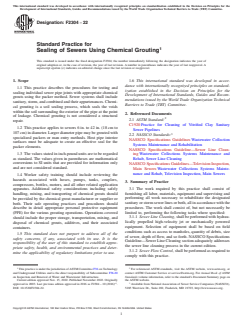 ASTM F2304-22 is a standard published by ASTM International. Its full title is "Standard Practice for Sealing of Sewers Using Chemical Grouting". This standard covers: SIGNIFICANCE AND USE 4.1 The inspection, testing, and repair of sewer pipe joints is a practice that can assist in maintaining and optimizing sewer performance. It is important to identify methods that use the most current compounds and technology to ensure the reduction of infiltration and exfiltration. The method selected should utilize environmentally safe grout and minimize the disruption of traffic. 4.2 This practice serves as a means to inspect, test, and seal sewer pipe joints, having selected the appropriate chemical grouts, using the packer method. Television inspection and joint testing are used to identify sewer line conditions, defective joints, and document the repairs undertaken. Instruction on joint sealing, if necessary, is then detailed, using pressure injection into the soils encompassing the pipe joint with a chemical grout (chemical sealing material). 4.3 This practice should not be used for longitudinally cracked pipe, severely corroded pipe, structurally unsound pipe, flattened, or out-of-roundpipe. In areas with high groundwater pressure, greater than 10 psi (68.9 ksi) at the test point, consult equipment manufacturers. SCOPE 1.1 This practice describes the procedures for testing and sealing individual sewer pipe joints with appropriate chemical grouts using the packer method. Sewer systems shall include sanitary, storm, and combined and their appurtenances. Chemical grouting is a soil sealing process, which seals the voids within the soil surrounding the exterior of the pipe at the point of leakage. Chemical grouting is not considered a structural repair. 1.2 This practice applies to sewers 6 in. to 42 in. (18 cm to 107 cm) in diameter. Larger diameter pipe may be grouted with specialized packers or man entry methods. Host pipe interior surfaces must be adequate to create an effective seal for the packer elements. 1.3 The values stated in inch-pound units are to be regarded as standard. The values given in parentheses are mathematical conversions to SI units that are provided for information only and are not considered standard. 1.4 Worker safety training should include reviewing the hazards associated with hoses, pumps, tanks, couplers, compressors, bottles, motors, and all other related application apparatus. Additional safety considerations including safely handling, mixing, and transporting of chemical grouts should be provided by the chemical grout manufacturer or supplier or both. Their safe operating practices and procedures should describe in detail appropriate personal protective equipment (PPE) for the various grouting operations. Operations covered should include the proper storage, transportation, mixing, and disposal of chemical grouts, additives, and their associated containers. 1.5 This standard does not purport to address all of the safety concerns, if any, associated with its use. It is the responsibility of the user of this standard to establish appropriate safety, health, and environmental practices and determine the applicability of regulatory limitations prior to use. 1.6 This international standard was developed in accordance with internationally recognized principles on standardization established in the Decision on Principles for the Development of International Standards, Guides and Recommendations issued by the World Trade Organization Technical Barriers to Trade (TBT) Committee.