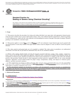 • Chemical Grouting Methods: Instructions are provided for the use of a packer device to inject chemical grout around pipe joints. The standard covers various grout types, such as acrylamide, acrylic, and urethane-based grouts, and sets out their performance expectations.