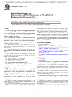 ASTM F2517-22e1 is a technical specification published by ASTM International. Its full title is "Standard Specification for Determination of Child Resistance of Portable Fuel Containers for Consumer Use". This standard covers: ABSTRACT This specification establishes recognized requirements for determining the child resistance of portable gasoline containers intended for use by consumers. The following tests shall be performed: senior adult test; child-resistant test (test subject/selection criteria); child-resistant tests (test failures); sequential test; and senior adult use effectiveness to conform with the specified requirements. SCOPE 1.1 This specification establishes recognized requirements for determining the child resistance of portable fuel containers (PFCs) and other types of portable containers intended for use by consumers to hold, store, and transport liquid fuels such as gasoline, kerosene, and diesel. 1.1.1 “Portable Fuel Container” is defined in Specification F852 and includes the receptacle for gasoline, kerosene, or diesel fuel as well as spouts, caps, and other closure mechanisms and components for use with or on portable gasoline, kerosene, or diesel receptacles. 1.1.2 This specification is also applicable to spouts, caps, or other closure mechanisms sold separately for use with or on a fuel container. 1.1.3 This specification does not cover one-time use portable emergency fuel containers conforming to Specification F2874. 1.2 This standard addresses the effectiveness of the child resistance (CR) device only after closure cycling, but does not address closure effectiveness: 1.2.1 When at high or low temperatures, 1.2.2 After thermal aging of polymers, 1.2.3 After exposure to sunlight, 1.2.4 After exposure to intended fuels, and 1.2.5 After physical abuses, such as drops or impacts. Note 1: Please see Appendix X2 for additional information on these exemptions. 1.3 The values stated in inch-pound units are to be regarded as standard. The values given in parentheses are mathematical conversions to SI units that are provided for information only and are not considered standard. 1.4 This standard does not purport to address all of the safety concerns, if any, associated with its use. It is the responsibility of the user of this standard to establish appropriate safety, health, and environmental practices and determine the applicability of regulatory limitations prior to use. 1.5 This international standard was developed in accordance with internationally recognized principles on standardization established in the Decision on Principles for the Development of International Standards, Guides and Recommendations issued by the World Trade Organization Technical Barriers to Trade (TBT) Committee.