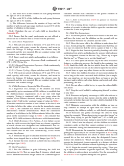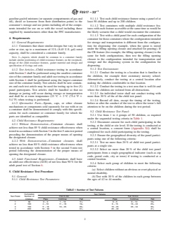 ABSTRACT This specification establishes recognized requirements for determining the child resistance of portable gasoline containers intended for use by consumers. The following tests shall be performed: senior adult test; child-resistant test (test subject/selection criteria); child-resistant tests (test failures); sequential test; and senior adult use effectiveness to conform with the specified requirements. SCOPE 1.1 This specification establishes recognized requirements for determining the child resistance of portable fuel containers (PFCs) and other types of portable containers intended for use by consumers to hold, store, and transport liquid fuels such as gasoline, kerosene, and diesel. 1.1.1 “Portable Fuel Container” is defined in Specification F852 and includes the receptacle for gasoline, kerosene, or diesel fuel as well as spouts, caps, and other closure mechanisms and components for use with or on portable gasoline, kerosene, or diesel receptacles. 1.1.2 This specification is also applicable to spouts, caps, or other closure mechanisms sold separately for use with or on a fuel container. 1.1.3 This specification does not cover one-time use portable emergency fuel containers conforming to Specification F2874. 1.2 This standard addresses the effectiveness of the child resistance (CR) device only after closure cycling, but does not address closure effectiveness: 1.2.1 When at high or low temperatures, 1.2.2 After thermal aging of polymers, 1.2.3 After exposure to sunlight, 1.2.4 After exposure to intended fuels, and 1.2.5 After physical abuses, such as drops or impacts. Note 1: Please see Appendix X2 for additional information on these exemptions. 1.3 The values stated in inch-pound units are to be regarded as standard. The values given in parentheses are mathematical conversions to SI units that are provided for information only and are not considered standard. 1.4 This standard does not purport to address all of the safety concerns, if any, associated with its use. It is the responsibility of the user of this standard to establish appropriate safety, health, and environmental practices and determine the applicability of regulatory limitations prior to use. 1.5 This international standard was developed in accordance with internationally recognized principles on standardization established in the Decision on Principles for the Development of International Standards, Guides and Recommendations issued by the World Trade Organization Technical Barriers to Trade (TBT) Committee.