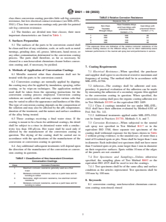 ABSTRACT This specification covers the requirements relating to rinsed and non-rinsed non-hexavalent chromium conversion coatings on aluminum and aluminum alloys intended to retard corrosion; as a base for organic films including paints, plastics, and adhesives; and as.a protective coating having a low electrical contact impedance. Coatings are categorized into four classes according to corrosion protection and finish. The type of conversion coating depends on the composition of the solution and may also be affected by pH, temperature, duration of the treatment, and the nature and surface condition. Films are normally applied by dipping, but may also be applied by inundation, spraying, roller coating, or by wipe-on techniques. Coatings shall adhere to specified electrical resistance, adhesion, and corrosion resistance requirements. SCOPE 1.1 This specification covers the requirements relating to rinsed and non-rinsed non-hexavalent chromium conversion coatings on aluminum and aluminum alloys intended to give protection against corrosion and as a base for other coatings. 1.2 Aluminum and aluminum alloys are conversion coated in order to retard corrosion; as a base for organic films including paints, plastics, and adhesives; and as a protective coating having a low electrical contact impedance. 1.3 This standard does not purport to address all of the safety concerns, if any, associated with its use. It is the responsibility of the user of this standard to establish appropriate safety, health, and environmental practices and determine the applicability of regulatory requirements prior to use. 1.4 This international standard was developed in accordance with internationally recognized principles on standardization established in the Decision on Principles for the Development of International Standards, Guides and Recommendations issued by the World Trade Organization Technical Barriers to Trade (TBT) Committee.