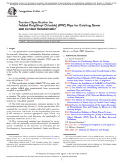ASTM F1504-21e1 is a technical specification published by ASTM International. Its full title is "Standard Specification for Folded Poly(Vinyl Chloride) (PVC) Pipe for Existing Sewer and Conduit Rehabilitation". This standard covers: ABSTRACT This specification covers the material, dimensional, and requirements and corresponding test methods for folded poly(vinyl chloride) (PVC) pipes suitable for the rehabilitation of existing nonpressure sewers and conduits, wherein the folded PVC pipe is inserted into, and then expanded to conform to the wall of, the original conduit forming a new pipe-within-a-pipe structure. This specification does not include pipes manufactured from reprocessed, recycled, or reclaimed PVC. Appropriately sampled specimens shall be tested, and shall thereby conform accordingly to specified requirements for flattening resistance, impact strength, stiffness, extrusion quality by acetone immersion and heat reversion, flexural modulus of elasticity, and rounded pipe diameter and wall thickness. SCOPE 1.1 This specification covers requirements and test methods for materials, dimensions, workmanship, flattening resistance, impact resistance, pipe stiffness, extrusion quality, and a form of marking for folded poly(vinyl chloride) (PVC) pipe for existing sewer and conduit rehabilitation. 1.2 Folded PVC pipe produced to this specification is for use in non-pressure sewer and conduit rehabilitation where the folded PVC pipe is inserted into and then expanded to conform to the wall of the original conduit forming a new pipe-within-a-pipe. Note 1: For installation procedures and engineering design considerations refer to Practice F1947. 1.3 This specification includes folded PVC pipe made only from materials specified in Section 6. This specification does not include folded pipe manufactured from reprocessed, recycled, or reclaimed PVC. 1.4 The values stated in inch-pound units are to be regarded as standard. The values given in parentheses are mathematical conversions to SI units that are provided for information only and are not considered standard. 1.5 The following precautionary statement pertains to the test method portion only, Section 11, of this specification: This standard does not purport to address all of the safety concerns, if any, associated with its use. It is the responsibility of the user of this standard to establish appropriate safety, health, and environmental practices and determine the applicability of regulatory limitations prior to use. 1.6 This international standard was developed in accordance with internationally recognized principles on standardization established in the Decision on Principles for the Development of International Standards, Guides and Recommendations issued by the World Trade Organization Technical Barriers to Trade (TBT) Committee.