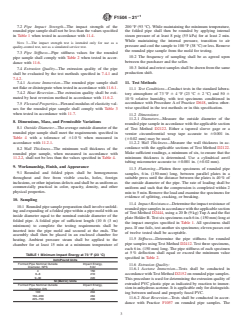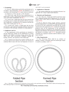 ABSTRACT This specification covers the material, dimensional, and requirements and corresponding test methods for folded poly(vinyl chloride) (PVC) pipes suitable for the rehabilitation of existing nonpressure sewers and conduits, wherein the folded PVC pipe is inserted into, and then expanded to conform to the wall of, the original conduit forming a new pipe-within-a-pipe structure. This specification does not include pipes manufactured from reprocessed, recycled, or reclaimed PVC. Appropriately sampled specimens shall be tested, and shall thereby conform accordingly to specified requirements for flattening resistance, impact strength, stiffness, extrusion quality by acetone immersion and heat reversion, flexural modulus of elasticity, and rounded pipe diameter and wall thickness. SCOPE 1.1 This specification covers requirements and test methods for materials, dimensions, workmanship, flattening resistance, impact resistance, pipe stiffness, extrusion quality, and a form of marking for folded poly(vinyl chloride) (PVC) pipe for existing sewer and conduit rehabilitation. 1.2 Folded PVC pipe produced to this specification is for use in non-pressure sewer and conduit rehabilitation where the folded PVC pipe is inserted into and then expanded to conform to the wall of the original conduit forming a new pipe-within-a-pipe. Note 1: For installation procedures and engineering design considerations refer to Practice F1947. 1.3 This specification includes folded PVC pipe made only from materials specified in Section 6. This specification does not include folded pipe manufactured from reprocessed, recycled, or reclaimed PVC. 1.4 The values stated in inch-pound units are to be regarded as standard. The values given in parentheses are mathematical conversions to SI units that are provided for information only and are not considered standard. 1.5 The following precautionary statement pertains to the test method portion only, Section 11, of this specification: This standard does not purport to address all of the safety concerns, if any, associated with its use. It is the responsibility of the user of this standard to establish appropriate safety, health, and environmental practices and determine the applicability of regulatory limitations prior to use. 1.6 This international standard was developed in accordance with internationally recognized principles on standardization established in the Decision on Principles for the Development of International Standards, Guides and Recommendations issued by the World Trade Organization Technical Barriers to Trade (TBT) Committee.