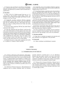 - Equipment and Handling: The standard provides requirements for equipment such as filtration units, vacuum sources, and sterile materials, and stresses the importance of proper membrane handling and apparatus setup to avoid test artifacts.
