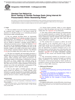 SIGNIFICANCE AND USE 5.1 This test provides a rapid means of evaluating tendencies for package seal failure when the package is exposed to a pressure differential. Pressure differentials may occur during such processes as sterilization and transportation. This test method provides an indicator of the burst strength of a package, where the burst will normally occur in one or more areas of the seal. An indicator of the minimum burst strength may be of importance to the package manufacturer and end user in ensuring adequate package integrity. This test method cannot provide a measure of package seal uniformity. This test method also cannot provide an evaluation of overall package integrity or the burst strength of areas of the package that contact the surface of the restraining plates used. This test method should be combined with other methods of evaluating overall package integrity, uniformity of the package seal, or opening functionality, if so required. 5.2 This test frequently is used to quickly evaluate package seal strength during the manufacturing process and at various stages of the package's life cycle. 5.3 If correlations between pieces of test equipment are to be made it is important that all parameters of the test be equivalent. Typical parameters can include, but are not limited to the package size, material, type and configuration of seal, rate of air flow into the package, pressure detection sensing mechanism and sensitivity (machine response to pressure drop), position of test article, rigidity of restraining plates, and distance between restraining plates. See Appendix X2 for further information. 5.4 This test may not necessarily provide correlation with package seal strength as typically measured using Test Methods F1140 or F88 (or equivalents). SCOPE 1.1 This test method covers the procedure for determining the minimum burst strength of a seal placed around the perimeter of a flexible package as it is internally pressurized and enclosed within restraining plates. 1.2 The test methods described herein are functionally similar to Test Methods F1140 with the exception of the use of restraining plates. Test Methods F1140 describes methods of burst testing that do not include the use of restraining plates and are suitable to determine a packages general ability to withstand pressurization stresses. Under Test Methods F1140 the stresses are not distributed uniformly to all areas of the package seal. Under unrestrained conditions the stress on the package is highest at the middle of the pouch where it inflates to the packages maximum diameter; therefore, Test Methods F1140 may not reliably detect the weakest area of the seal. 1.3 The burst test internally and increasingly pressurizes a package until an area of the package seal around the perimeter “bursts” open in response to pressurization. By placing the package within restraining plates during pressurization, the dimensional stability of the package is maintained in a manner that results in stresses applied more uniformly along the perimeter of the package, where seals are normally placed. This allows the test to have a higher probability of detecting the weakest area of the seal and provide a measurement of the pressure required to “burst” open the package. 1.4 This test only applies to flexible packages with seals placed around the perimeter of a flexible package (often referred to as a pouch). In particular it is intended as applicable to packages with seals that have a peelable seal feature (peeled open by end user to remove contents of package). 1.4.1 Porous barrier materials' failure to reach adequate pressure to burst the package seals may be due to insufficient volume flow. See Appendix X4 for information. 1.5 The values stated in either SI units or inch-pound units are to be regarded separately as standard. The values stated in each system are not necessarily exact equivalents; therefore, to ensure conformance with t...